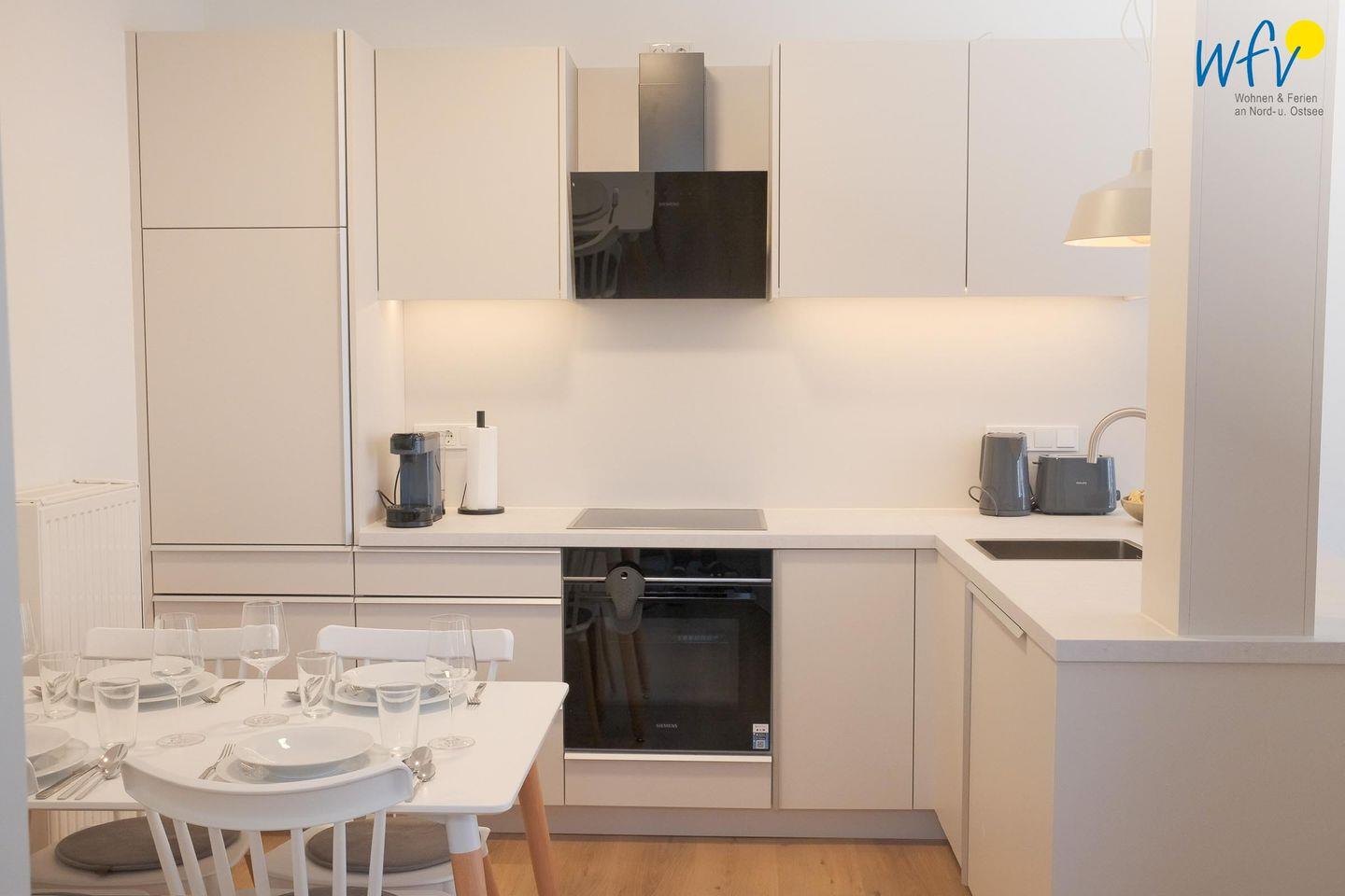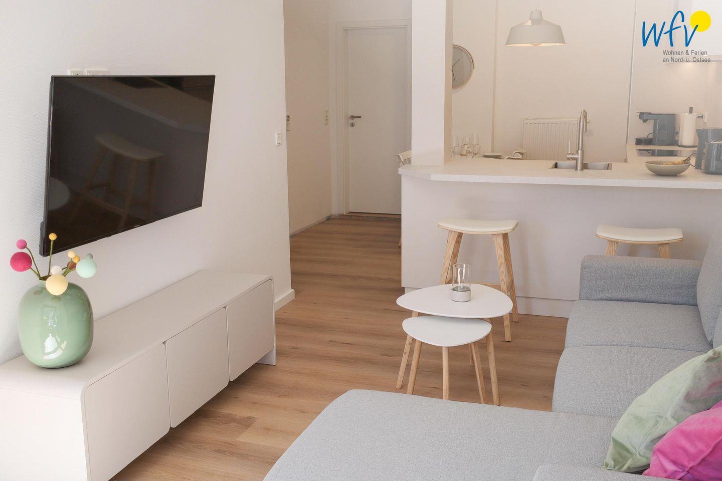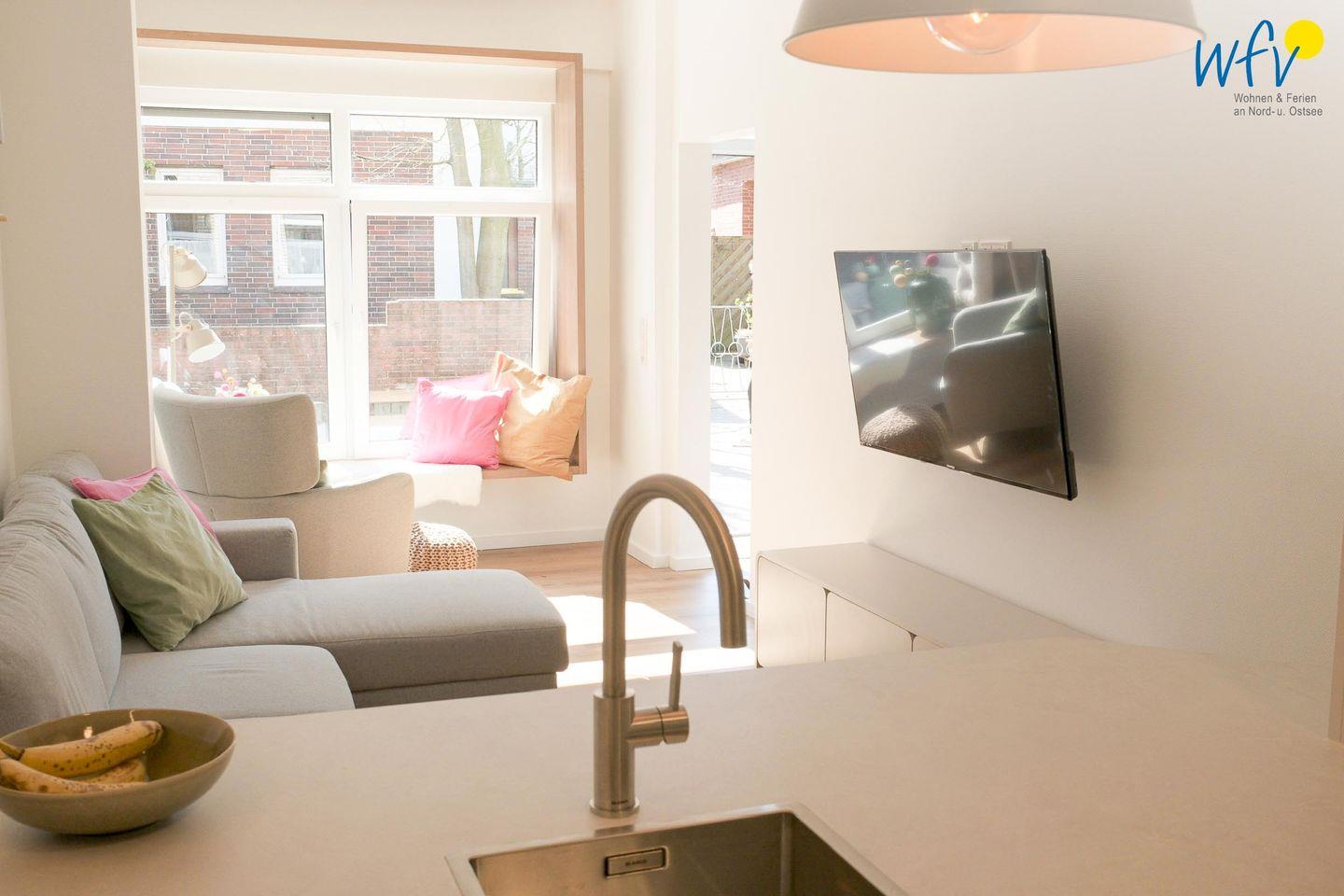 In dem hellen und offenen Wohnbereich mit Couch, Sessel und modernem Fernseher mit Sat-Empfang und Flat-TV lassen sich am Abend entspannte Stunden verbringen. Durch freies WLAN können Sie von Ihrem Smartphone aus auch in Ruhe im Internet surfen (16 MBits/s). Oder Sie lassen den Abend im Freien ausklingen: gemütliche Restaurants und kleine Bars in unmittelbarer Nähe servieren Ihnen Köstlichkeiten der Nordseeküche oder einen schmackhaften Sundowner - an der Promenade sogar inklusive Meeresblick!
