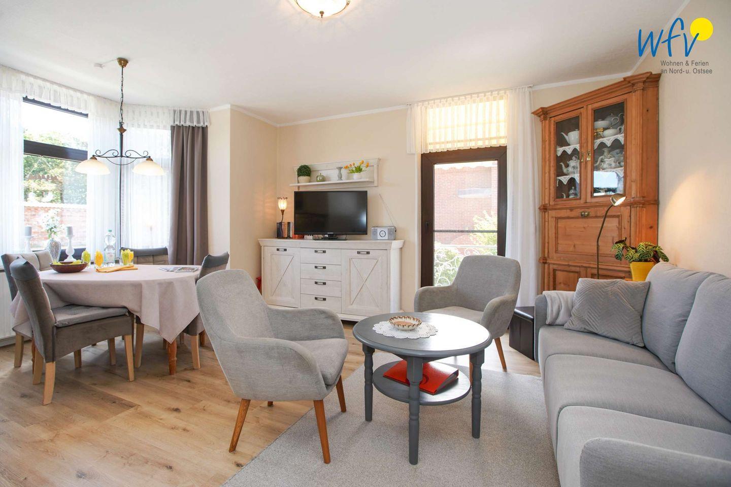Gemütliche Ferienwohnung "Sandburg" auf Borkum mit Terrasse und Garten, ideal für entspannte Urlaubstage an der Nordsee.