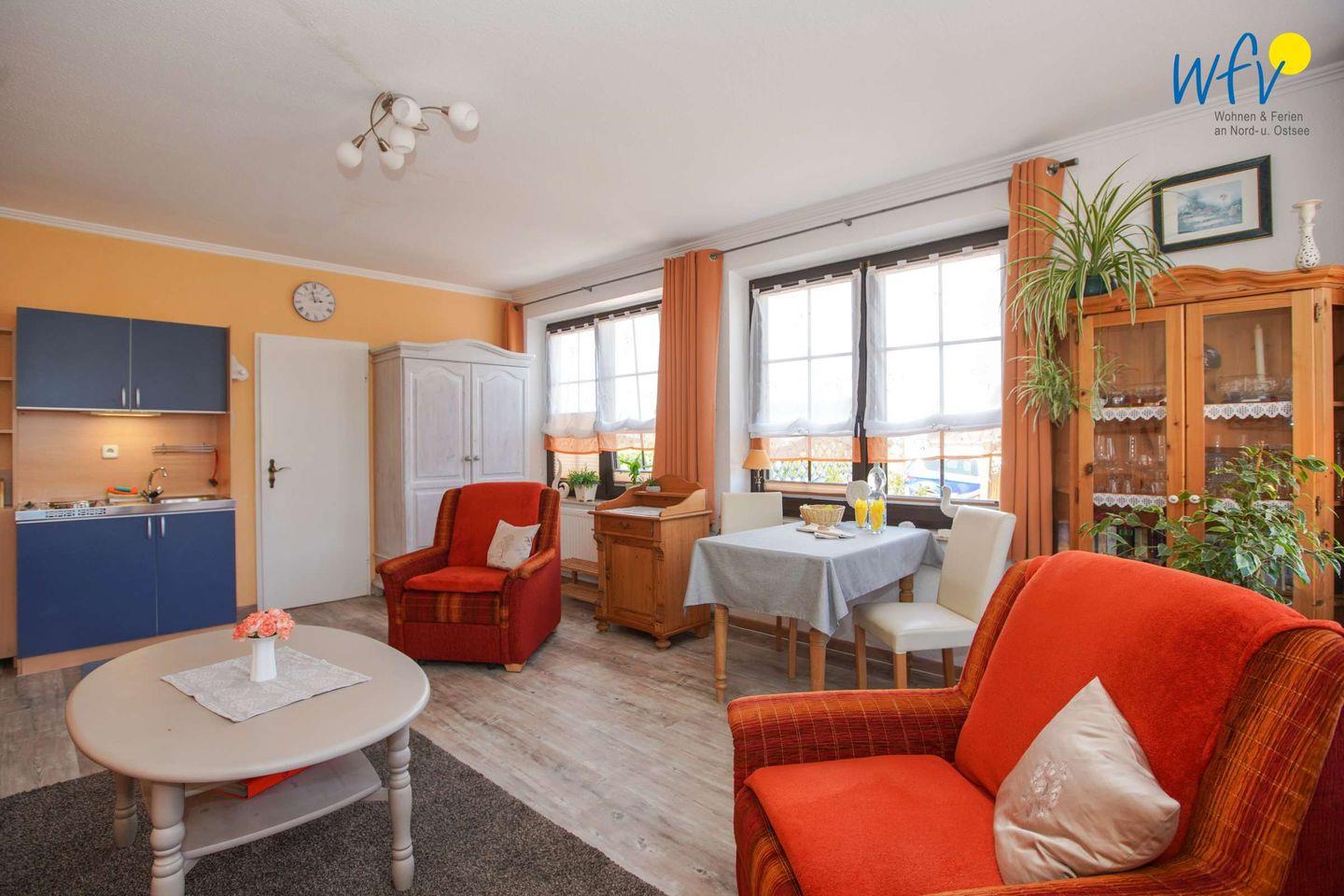 Ob nach dem Badetag, der Fahrradtour oder dem Strandspaziergang - im Wohnraum können Sie in der bequemen Couchecke mit TV (80 cm) rundum entspannen. Zum Surfen vom Smartphone aus empfangen Sie kostenlos freies WLAN.