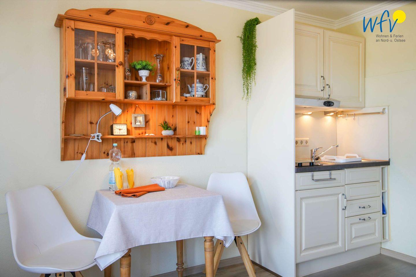 In der integrierten Küchenzeile (Pantryküche) lassen sich schnell und einfache Snacks für zwischendurch und kleine Gerichte zubereiten. Auf Borkum finden Sie außerdem viele Restaurants, die Sie mit einer köstlichen Nordseeküche verwöhnen. (In der Wohnung darf kein Fisch gebraten werden, wir bitten um Verständnis.)
