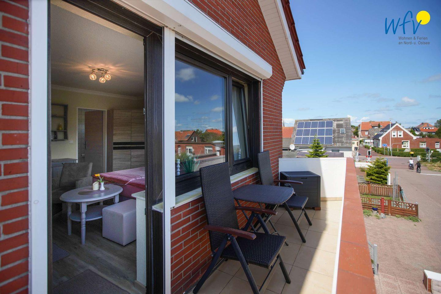 Wohltuende Nordseeluft genießen Sie auf dem schönen sonnigen Balkon! Zudem lädt der hübsch gestaltete Gemeinschaftsgarten mit Liegewiese und Gartenmöbeln zum Sonnen und Entspannen ein.