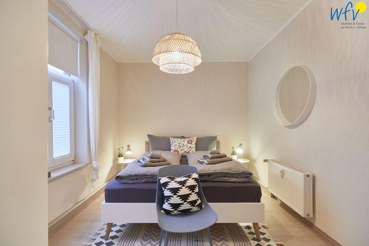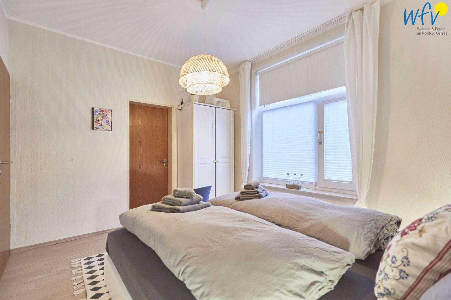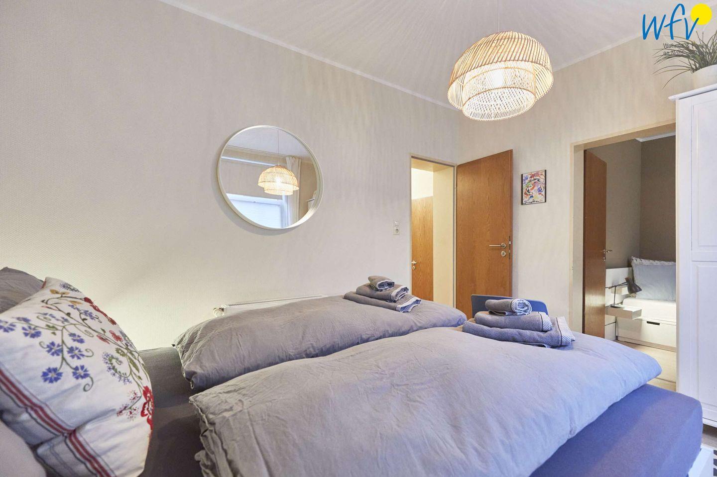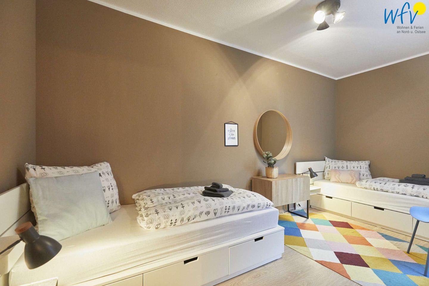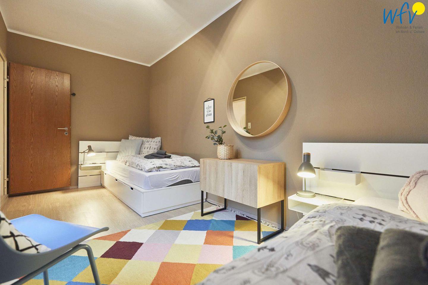 Zwei separate Schlafzimmer bieten Ihnen angenehme Rückzugsmöglichkeiten. In einem der Zimmer befindet sich ein Doppelbett (160 cm x 200 cm), in dem anderen zwei Einzelbetten (je 90 x 200 cm). Der Zugang erfolgt durch das andere Schlafzimmer (kleiner Treppenabsatz in den Durchgängen). Auf Anfrage können zwei weitere Personen auf der Schlafcouch übernachten - grundsätzlich ist die Wohnung allerdings für 4 Personen ausgelegt.