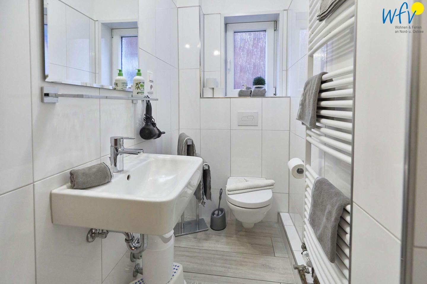 Ein modernes Tageslichtbad mit Dusche, WC, Waschbecken und Handtuchheizung ergänzt den Wohnkomfort.