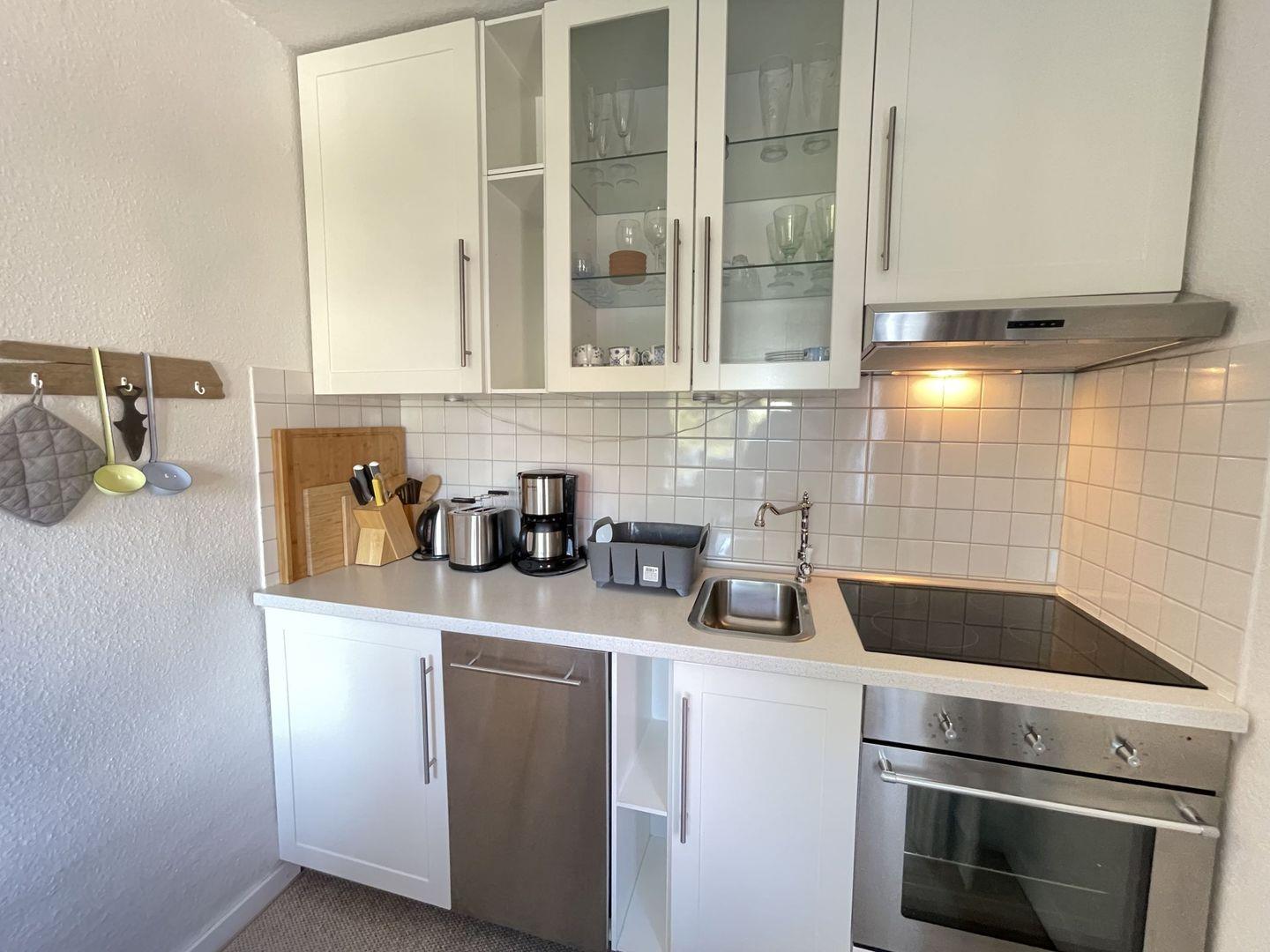 Die offene Küche ist mit allem ausgestattet, was Sie für die Zubereitung köstlicher Mahlzeiten benötigen. Sie verfügt über einen Cerankochfeld, Backofen, Geschirrspüler, Kühlschrank sowie eine Vielzahl an Küchenutensilien. Ob ein schnelles Frühstück oder ein umfangreiches Abendessen – hier bleibt kein Wunsch unerfüllt. Ein Haartrockner und Waschbecken im Badezimmer sowie eine Dusche mit Wanne sorgen für zusätzlichen Komfort.
