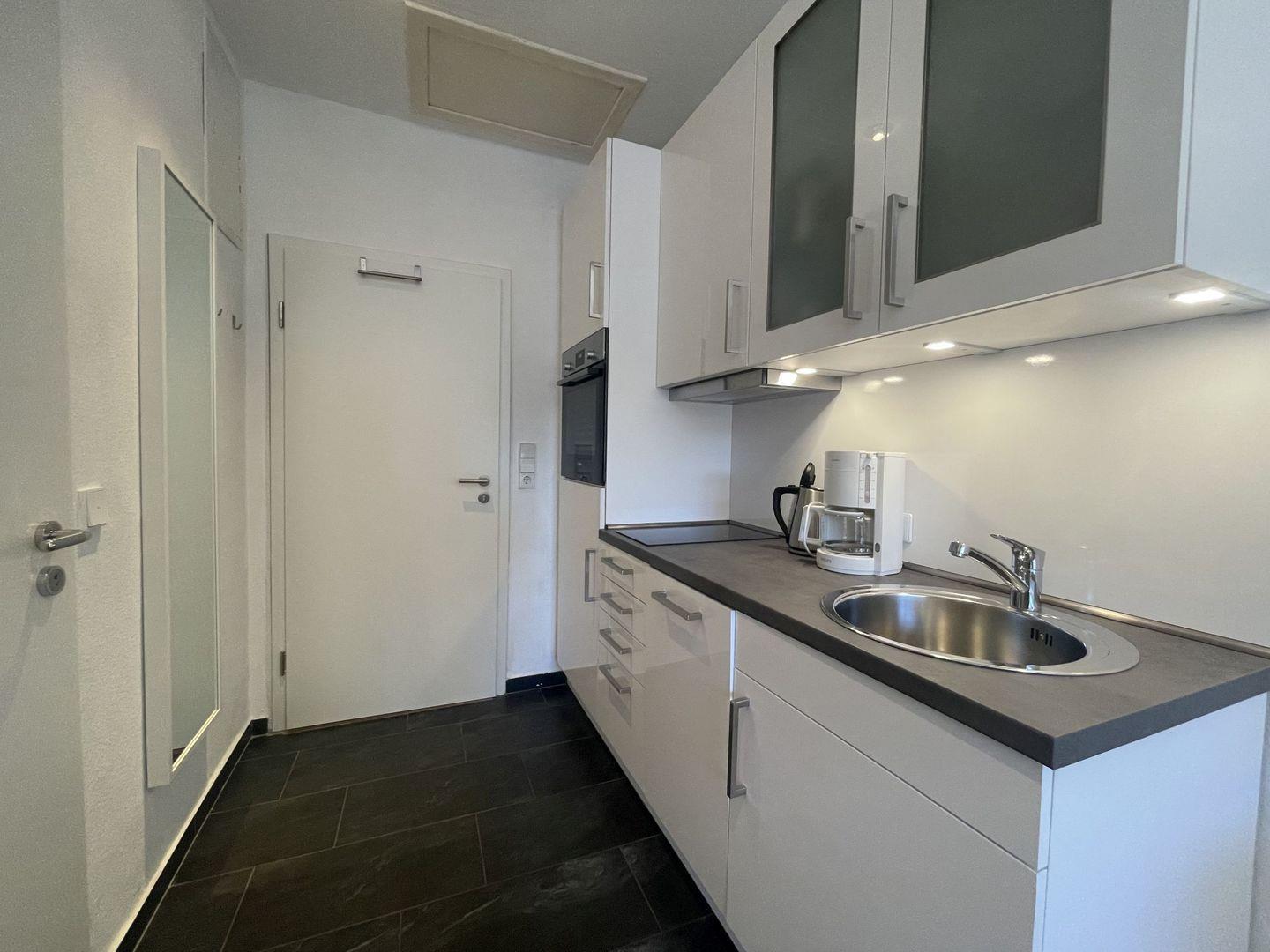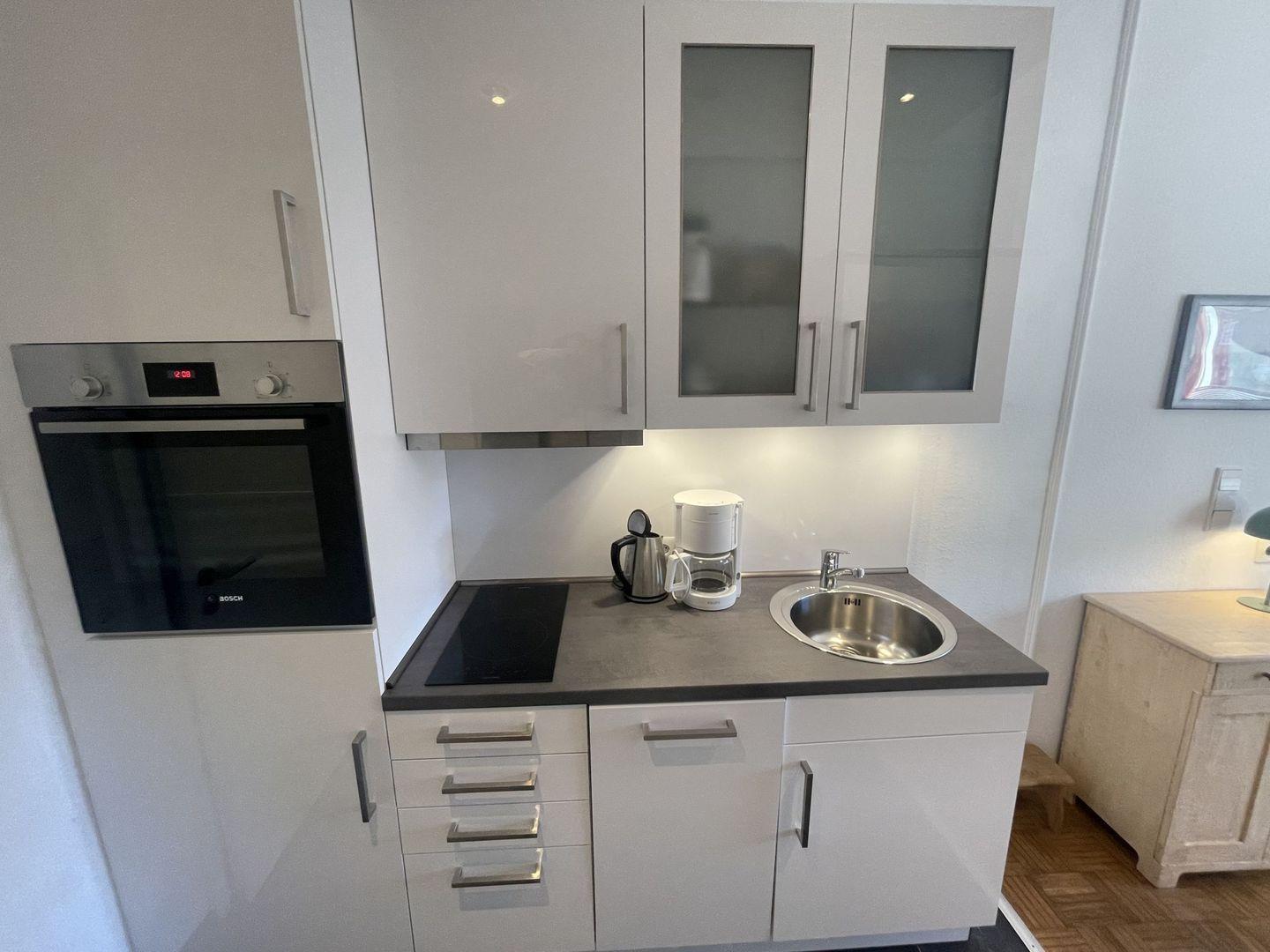 Die Kochnische in der Unterkunft ist modern eingerichtet und bietet Ihnen alles, was Sie brauchen, um Ihre Lieblingsgerichte zuzubereiten. Der Herd mit Ceranfeld, der Backofen sowie die Mikrowelle machen das Kochen zum Kinderspiel. Zusätzlich stehen Ihnen ein Kühlschrank und ein Gefrierfach zur Verfügung, um Ihre Lebensmittel zu lagern. Geschirr und Besteck sind ebenfalls vorhanden, sodass Sie sich bei Bedarf selbst versorgen können. Ein gemütlicher Esstisch und eine Sofaecke laden dazu ein, gemeinsame Mahlzeiten zu genießen oder einfach nur zu entspannen.