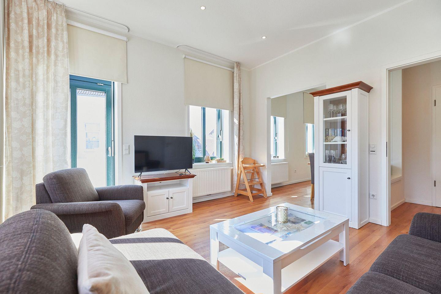 Die Wohnung Wiebke befindet sich im Obergeschoss des Hauptgebäudes der Villa Wilhelmine und bietet Platz für bis zu 4 Personen. Das Highlight der Wohnung ist die Dachterrasse mit einem einzigarten Ausblick über den historischen Ortskern der Insel.