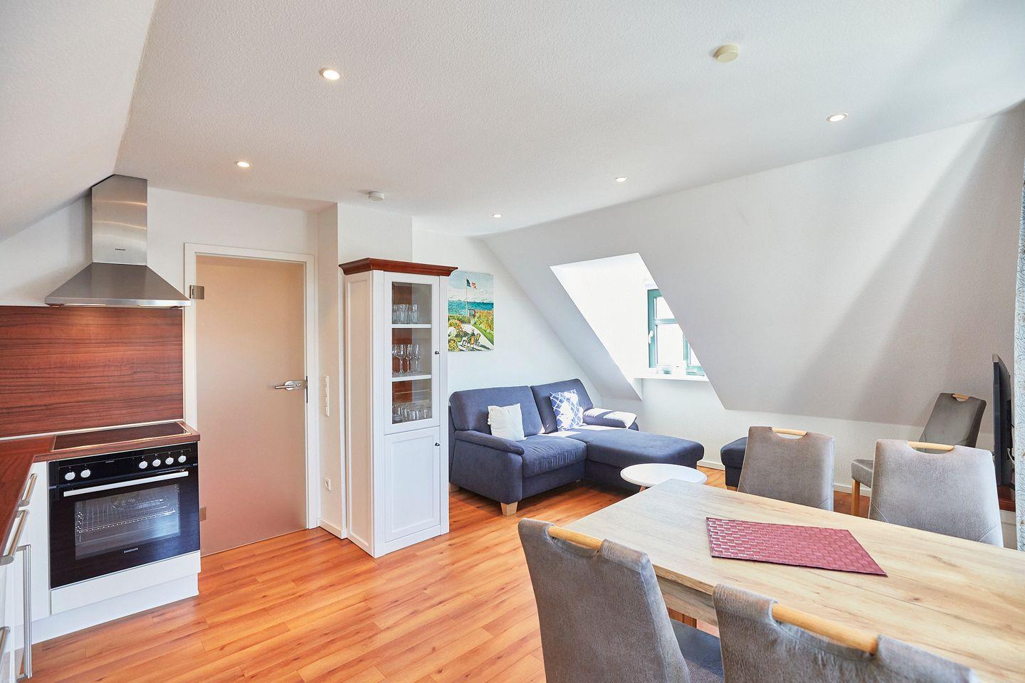 - Heller Wohn- & Essbereich mit offener Küche (Flachbild TV mit DVD, Radio und CD, E-Herd mit Ceranfeld, Backofen und Spülmaschine)