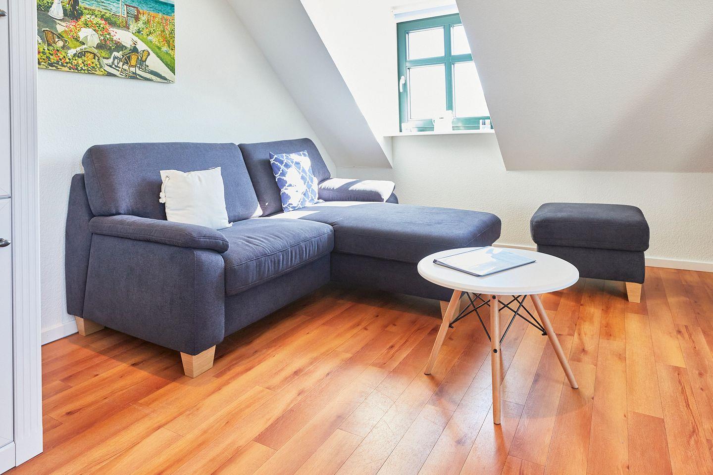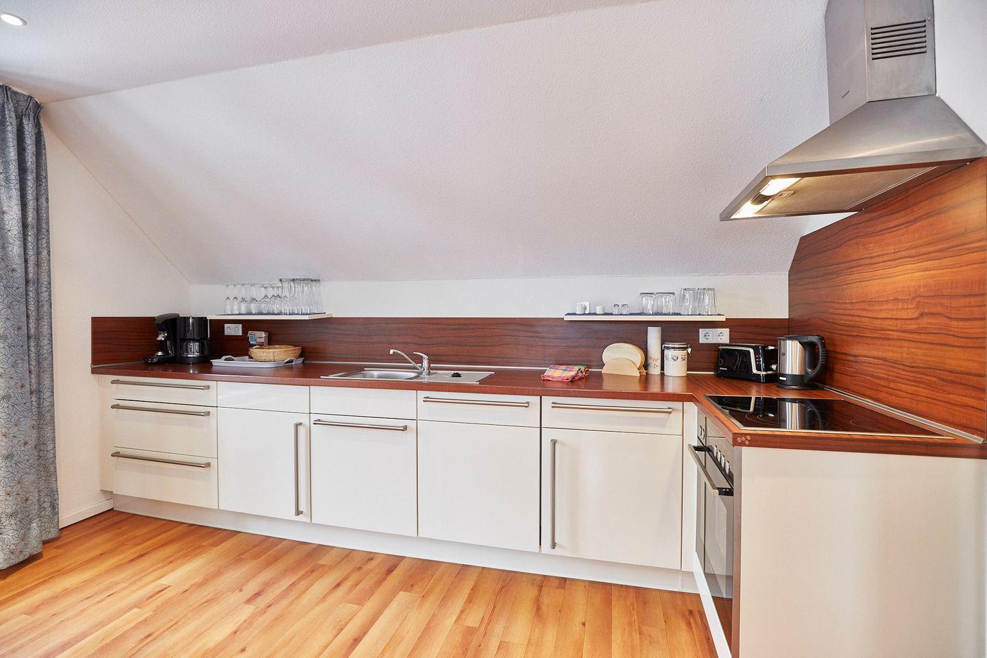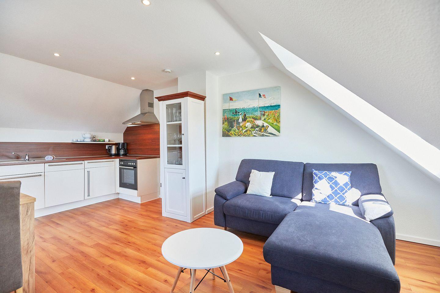 Die Wohnung Klein-Wiebke befindet sich im Dachgeschoss des Hauptgebäudes der Villa Wilhelmine und ist für 2 Personen sehr gut geeignet. Sie verfügt über ein Schlafzimmer mit einem Doppelbett, einem Wohnzimmer mit integrierter, komplett eingerichteter Küche sowie einem Bad mit Dusche und WC. Im Haus befindet sich auch eine Gemeinschaftssauna, die gegen Gebühr genutzt werden kann.