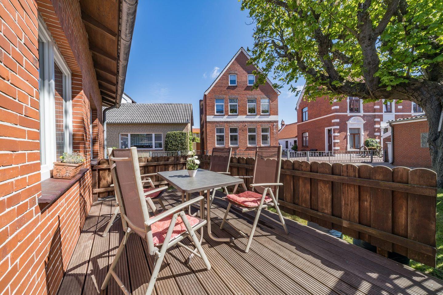 Großzügiger Ferienbungalow mit Terrasse und Gartenblick auf Borkum, ideal für Familien und Erholung.