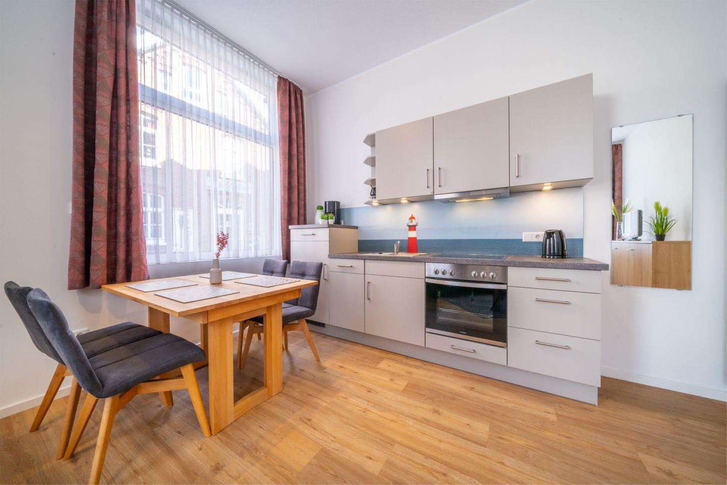 Große Fenster sorgen für viel Tageslicht und eine offene, einladende Atmosphäre. Die Wohnküche ist gut ausgestattet und bietet ausreichend Platz zum Kochen und Verweilen. Ergänzt wird sie durch kostenfreies WLAN und einen Smart-TV für entspannte Abende.