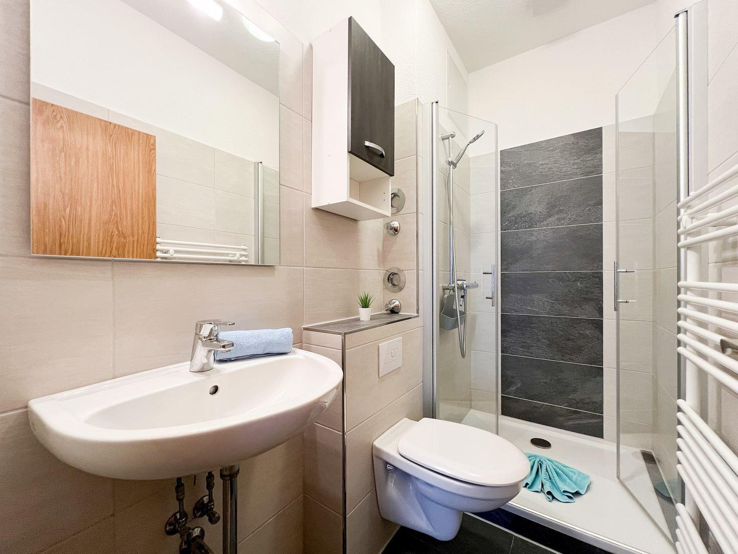 Das Schlafzimmer ist mit einem hochwertigen Boxspringbett eingerichtet. Zusätzlich steht im Wohnzimmer ein modernes Schrankbett zur Verfügung, das bei Bedarf eine getrennte Schlafmöglichkeit bietet. Das funktionale Duschbad ist modern gestaltet und praktisch angelegt.