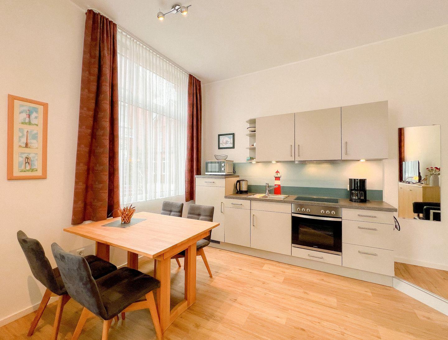 Willkommen in unserer hellen und modernen Ferienwohnung 2, die einst der Verkaufsraum der Bäckerei Juist war. Auf 38 qm bietet diese Wohnung alles, was Sie für einen komfortablen Aufenthalt benötigen. Die Wohnung ist hell und einladend mit großen Fenstern, die den Raum mit natürlichem Licht durchfluten. Sie verfügt über eine gut ausgestattete Wohnküche und ein modernes funktionales Duschbad. Im Schlafzimmer finden Sie ein hochwertiges Boxspringbett. Für zusätzliche Flexibilität sorgt das moderne Schrankbett im Wohnzimmer, das auf Wunsch getrenntes Schlafen ermöglicht. Zur Unterhaltung stehen Ihnen kostenfreies WLAN und Smart-TV zur Verfügung. Haustier- und rauchfrei garantiert sie allen Gästen einen angenehmen Aufenthalt.