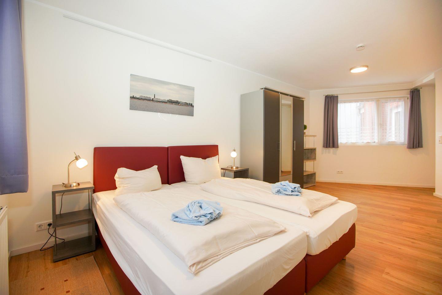 Die Wohnung verfügt über zwei gut geschnittene Schlafzimmer, die auch bei einem Aufenthalt mit mehreren Personen angenehm nutzbar sind. Der Wohnbereich ist offen gestaltet und geht in die integrierte Küche über. Hier ist alles vorhanden, um sich während des Aufenthalts gut zu versorgen.