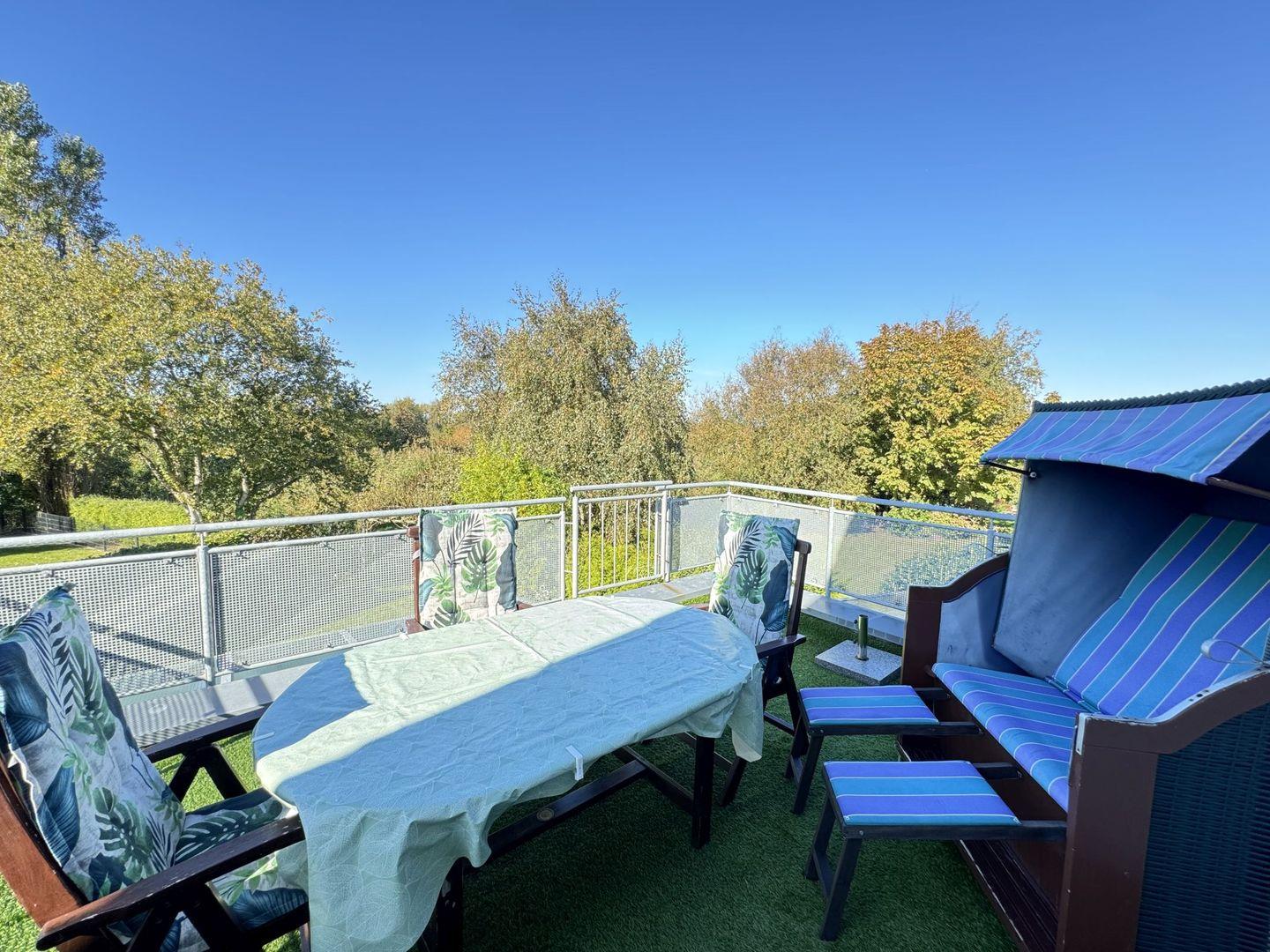 Moderne Ferienwohnung 'Nessie' auf Borkum mit Terrasse, Gartenmöbeln und haustierfreundlicher Atmosphäre.