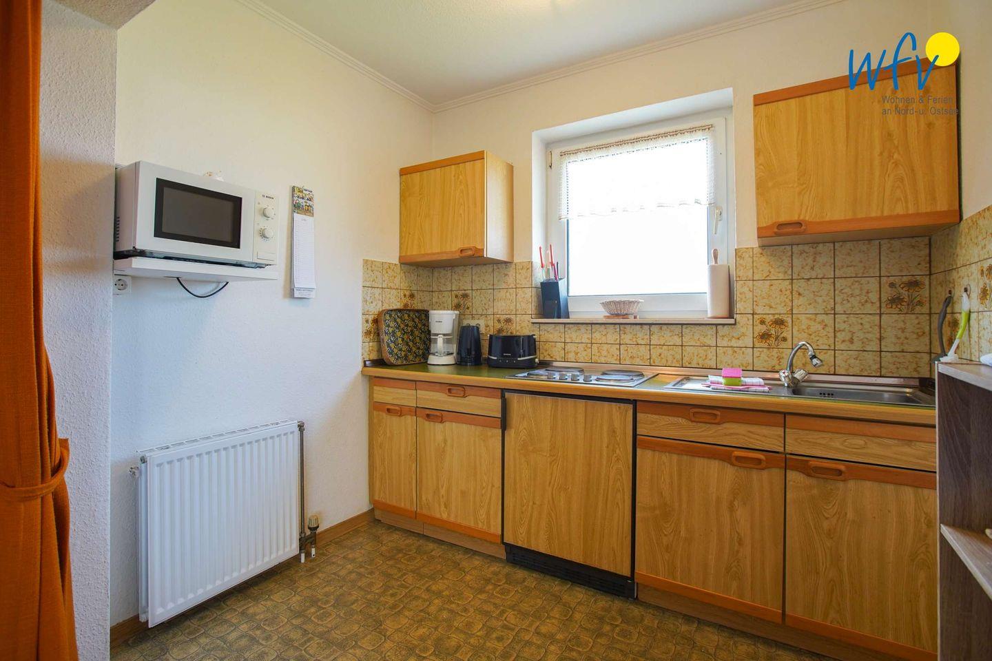 Am Essplatz mit schönem Lichteinfall starten Sie ruhig und entspannt in den Urlaubstag. Kaffee, Toast und Eier lassen sich bequem in der Küchenzeile mit 4-Plattenherd, Mikrowelle und diversen Kleingeräten zubereiten. So können Sie gemütlich den bevorstehenden Urlaubstag auf Borkum planen - mit Fahrradtour, Strandspaziergang oder Badetag.