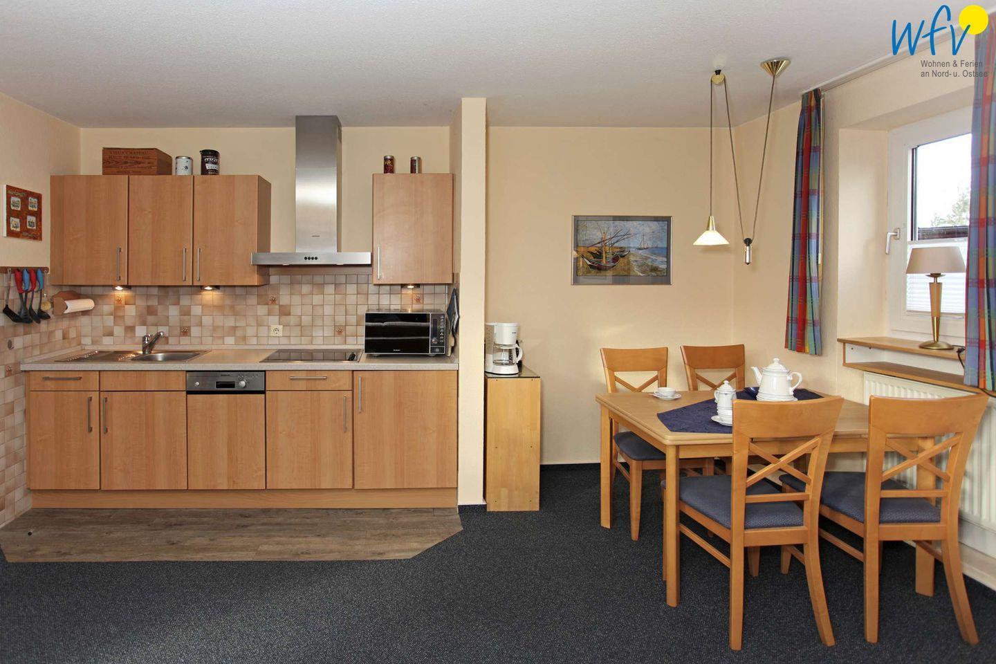 Für eine angenehme Selbstverpflegung in Ihrem Urlaub auf Borkum ist die Ferienwohnung mit einer kompletten Küche ausgestattet - u.a. mit Herd, Spülmaschine, Backofen und Mikrowelle sowie Kaffeemaschine, Wasserkocher und Toaster.