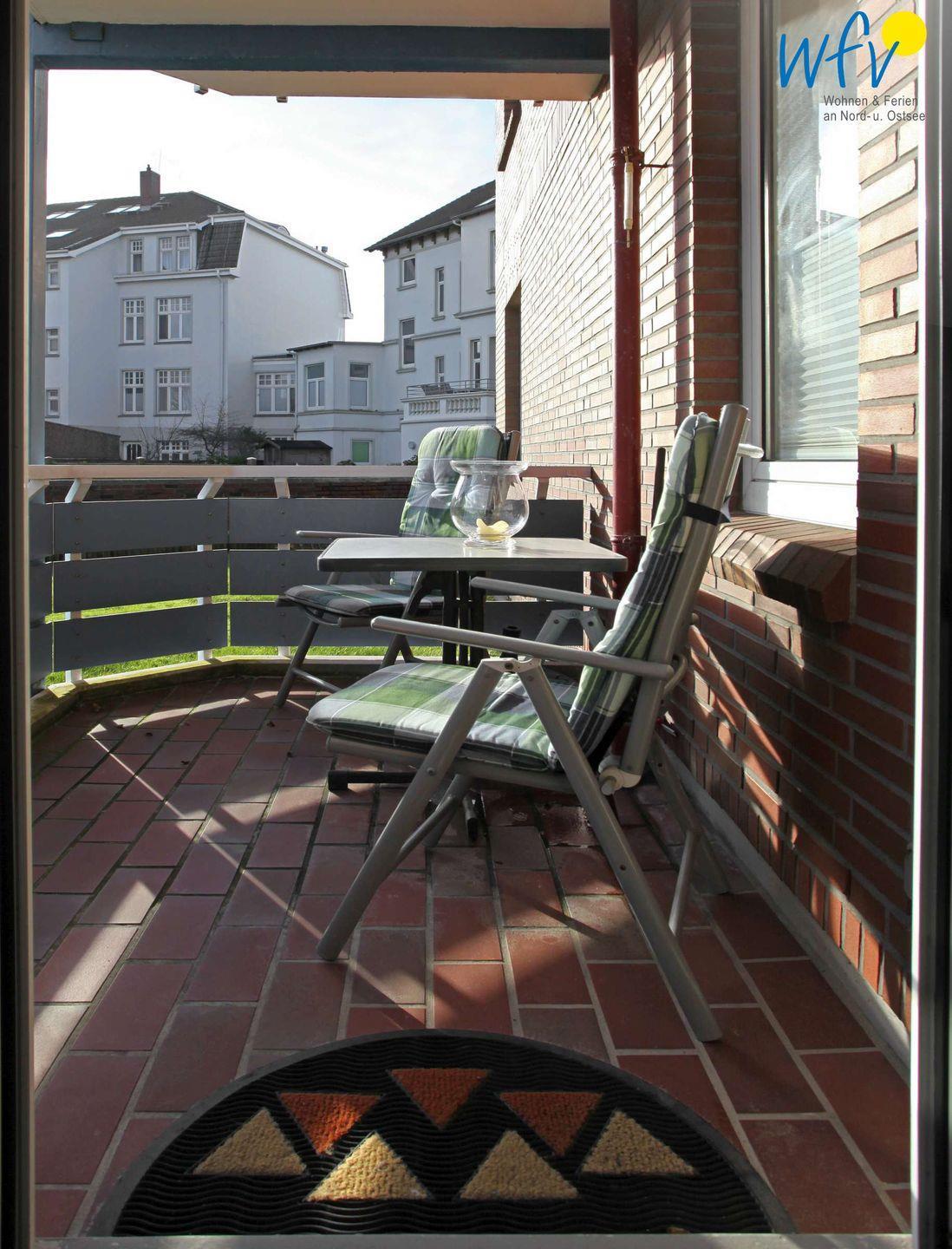 Der möblierte Balkon verwöhnt Sie mit einer wohltuenden Nordseebrise. Hier können Sie sich herrlich im bequemen Gartensessel zurücklehnen, die Seele baumeln lassen und die freie Zeit genießen. Ein wunderbares Urlaubsgefühl!