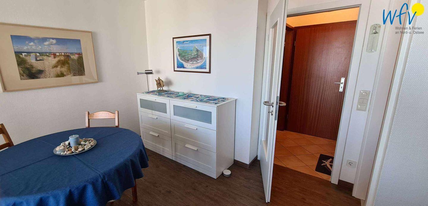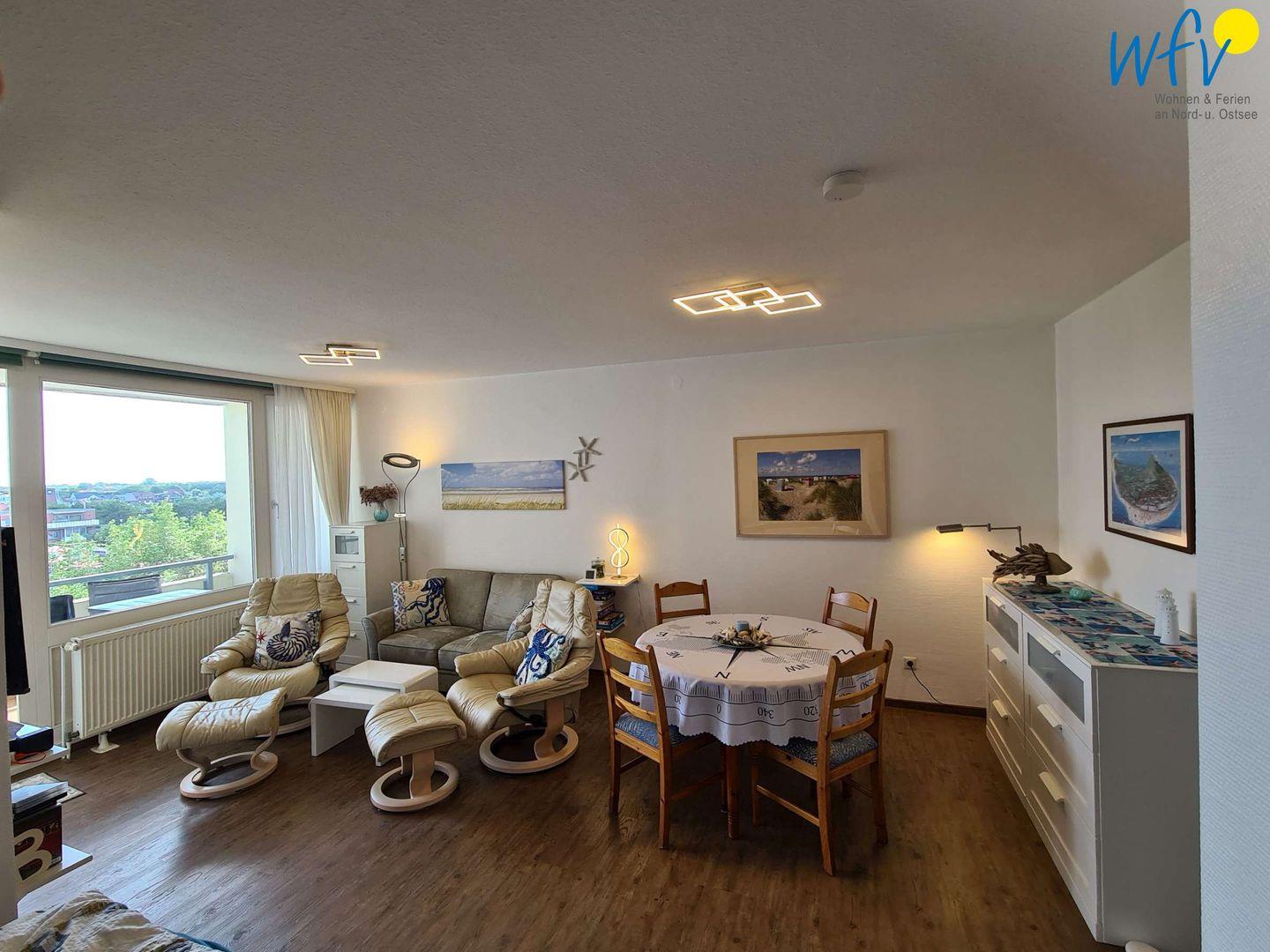 Für gemütliche Stunden lädt im Wohnraum eine Couchecke mit zwei Relaxsesseln, modernem TV (40 Zoll), DVD-Player, DVD`s sowie CD-Player und CD`s zum Entspannen ein. Auch der überdachte Balkon garantiert erholsame Urlaubszeiten: Durch seine Lage nach Osten können Sie hier bei Sonne und wohltuender Meeresbrise frühstücken - ein herrliches Urlaubsgefühl. Seitlich sehen Sie bereits die Nordsee!