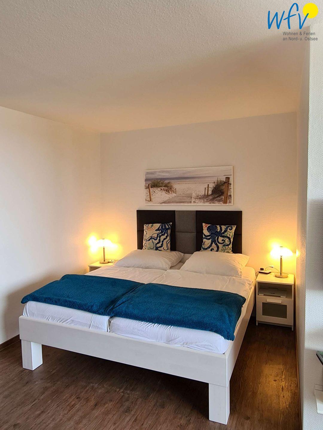Im Schlafbereich des Wohnraums befindet sich ein Doppelbett (180 x 200 cm). Das separate Schlafzimmer ist mit zwei Einzelbetten und einem Kleiderschrank ausgestattet.