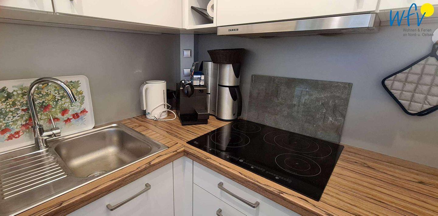 Damit Sie sich in Ihrem Urlaub auf Borkum bequem selbst verpflegen können, verfügt die offene Küche u.a. über einen 4-Platten-Induktionsherd, einen Backofen, eine Mikrowelle und eine Spülmaschine sowie über diverse Kleingeräte (Toaster, Kaffeemaschine, Wasserkocher, Eierkocher, Mixer).