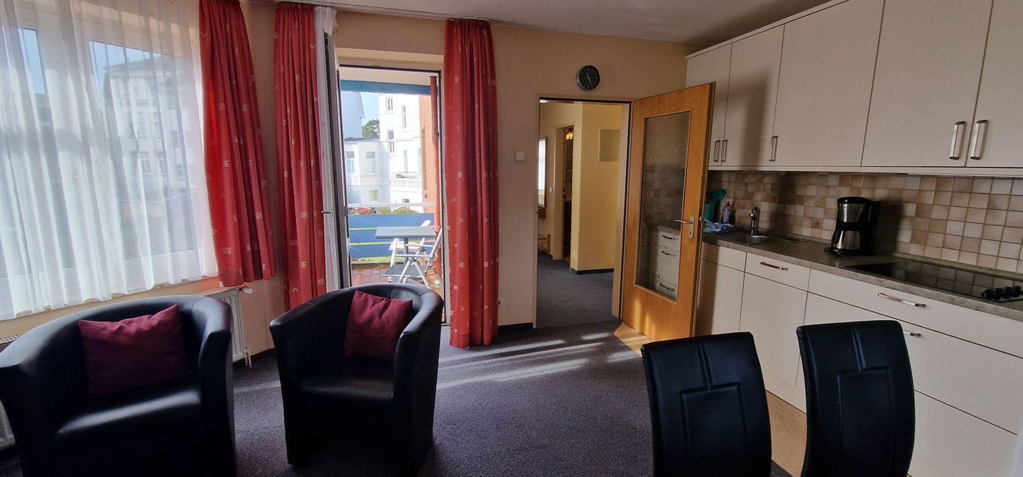 Unsere schöne Ferienwohnung liegt nur 300m vom Strand entfernt und auch Restaurant, Einkaufsmöglichkeiten, sowie Ärzte, Kureinrichtungen und der Bahnhof sind in nur wenigen Minuten zu Fuß erreichbar. Eine hervorragende Lage also. Die Ausstattung der Wohnung beinhaltet alles, was zu einem angenehmen Aufenthalt für bis zu 4 Personen enthält. Ein Schlafzimmer mit Doppelbett (200x200, offenes Fußende), im Wohnraum ein gemütliches Schlafsofa (160x200), und dort auch eine Küchenzeile mit Essplatz. Die Küche selbst hat auch Annehmlichkeiten zu bieten wie Spülmaschine, Herd und Backofen mit Mikrowelle, Kaffeemaschine, Wasserkocher, Toaster und Eierkocher nebst allen notwendigen Küchenutensilien, so dass Sie sich Ihre Mahlzeiten gut zubereiten können. Genießen Sie Ruhe und Ausblick auf dem Südbalkon, der mit Tisch und Stühlen ausgestattet ist. Ruhe vor dem stressigen Alltag heißt auch Abkehr vom medialen Stress. W-Lan ist in dieser Wohnung nicht vorhanden. Aber TV und Radio helfen darüber hinweg.