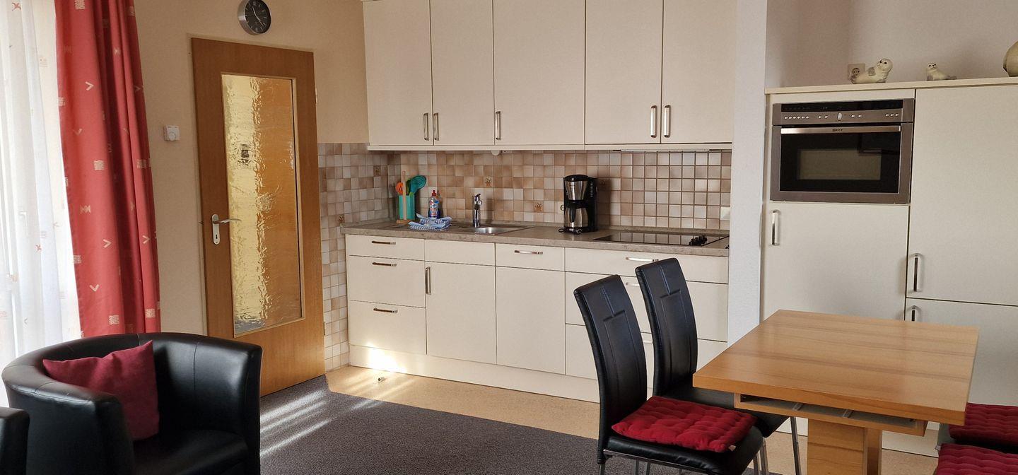 großer, gut ausgestatteter Küchenzeile, Schlafzimmer mit Doppelbett, Schlafcouch im Wohnraum, Parkplatz am Haus, gute Ausstattung