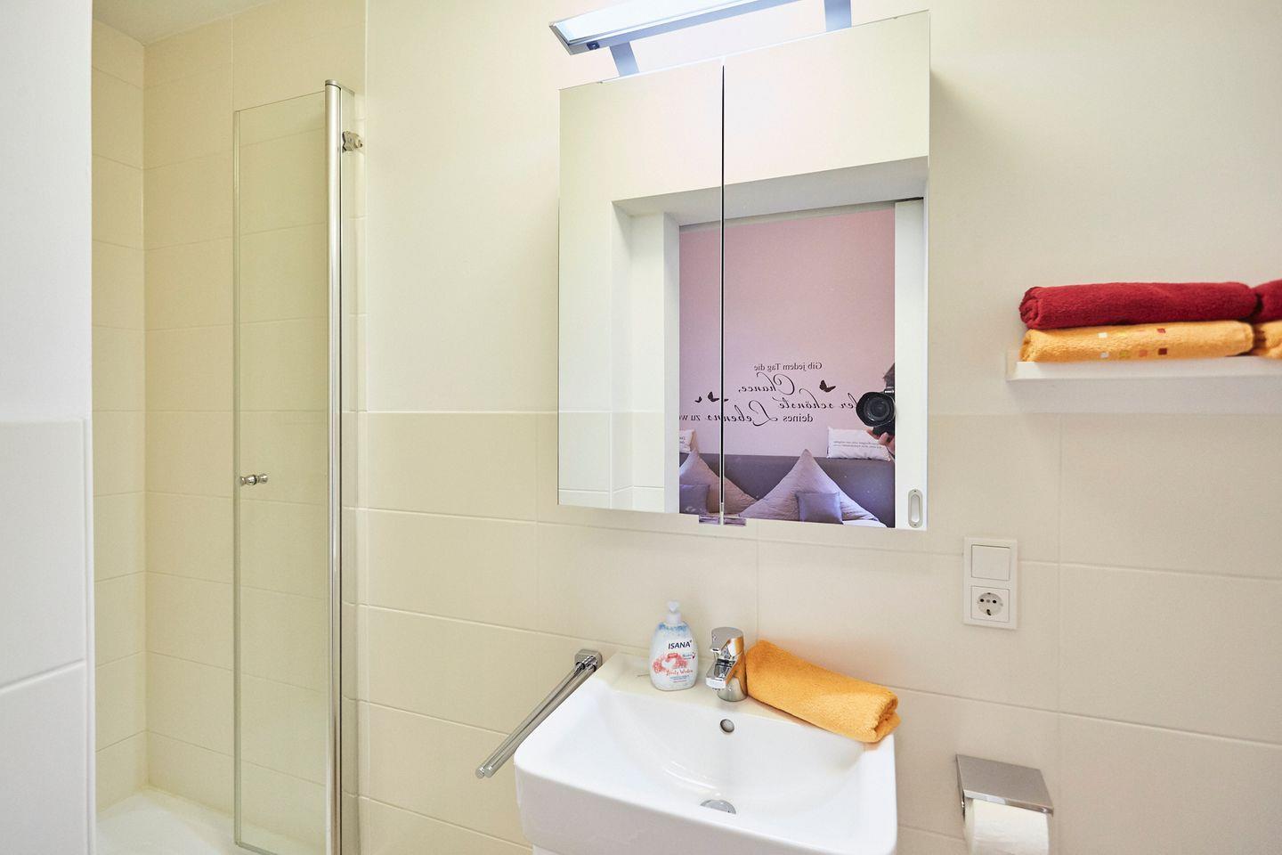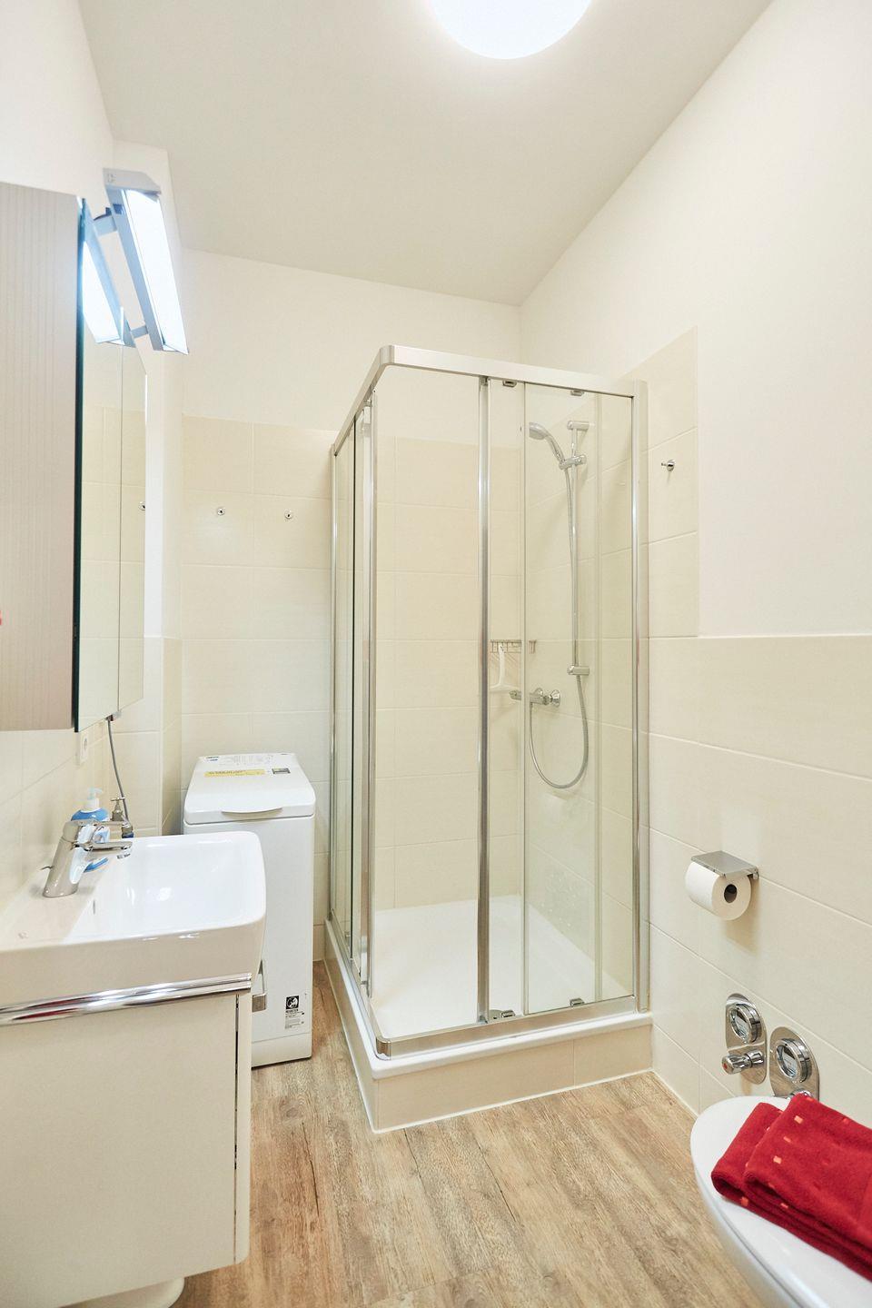 Die Ferienwohnung verfügt über zwei moderne, bodengleiche Duschen und insgesamt zwei Badezimmer, jeweils mit Haartrockner, Spiegel und Kosmetikspiegel. Badetücher, Handtücher und Bettwäsche sind im Mietpreis inbegriffen. Für den täglichen Komfort sind eine Waschmaschine, ein Trockner (zur Eigennutzung), Bügelbrett, Bügeleisen sowie Wäscheständer vorhanden. Sämtliche Fenster sind mit Sichtschutz ausgestattet, der Wohnkomfort wird durch eine zentrale Heizungsanlage ergänzt. Ein Garderoben- und Schuhschrank im Eingangsbereich bieten ausreichend Stauraum.