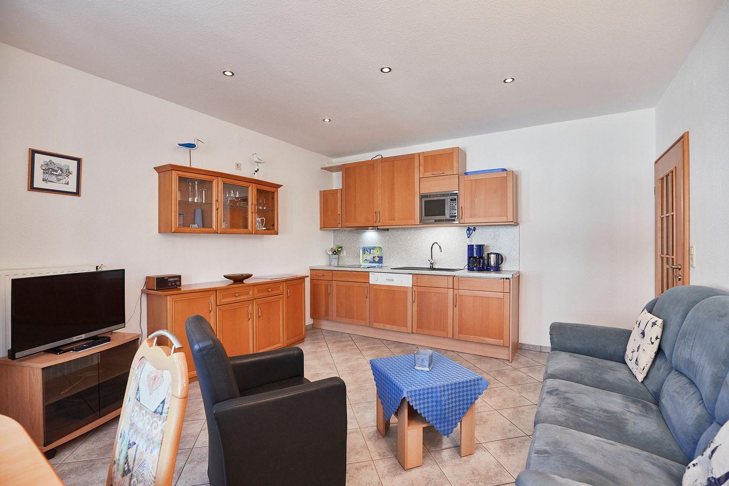 Ein helles Wohnzimmer mit einer Sofaecke lädt zum Entspannen ein, während Sie den digitalen TV-Anschluss oder das WLAN nutzen können. Die offene Küche ist vollständig ausgestattet: Hier finden Sie alles, was Sie zum Kochen benötigen, einschließlich einer Spülmaschine, einem Airfryer, Mikrowelle, Cerankochfeld und einer Kaffeemaschine. Ein Esstisch bietet genügend Platz für gemeinsame Mahlzeiten oder Spieleabende.