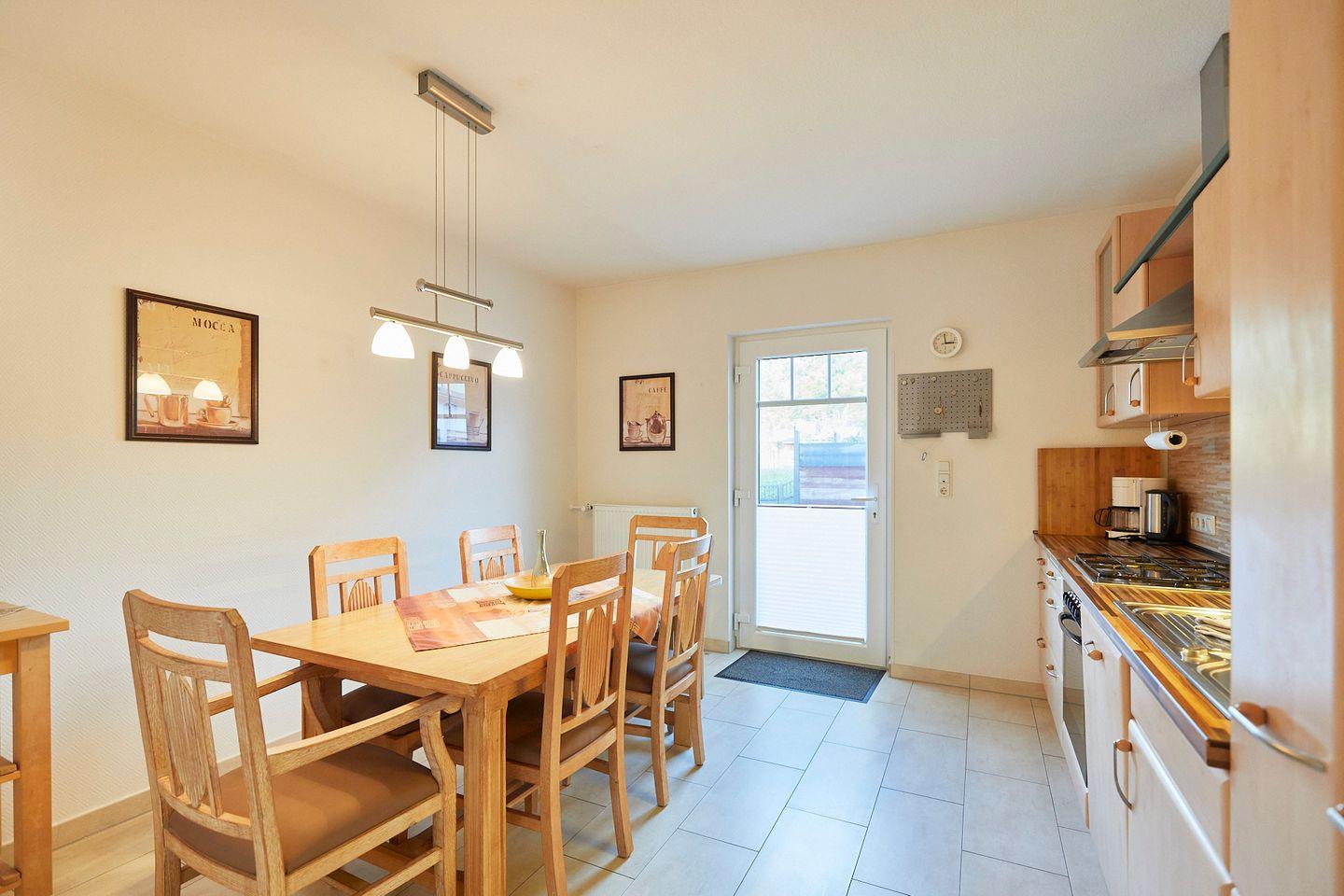 Die Ferienwohnung bietet auf großzügigen 90 m² Platz für bis zu vier Personen. Sie verfügt über zwei gemütliche Schlafzimmer, die mit Teppichboden ausgelegt sind und eine angenehme Atmosphäre schaffen. In der modernen, voll ausgestatteten Küche können Sie kulinarische Köstlichkeiten selbst zubereiten. Mit ihrem Gasherd, Backofen, Geschirrspüler, Mikrowelle und Kühlschrank sind alle Annehmlichkeiten vorhanden. Der angrenzende Essbereich lädt zu gemeinsamen Mahlzeiten und gemütlichen Abenden ein.