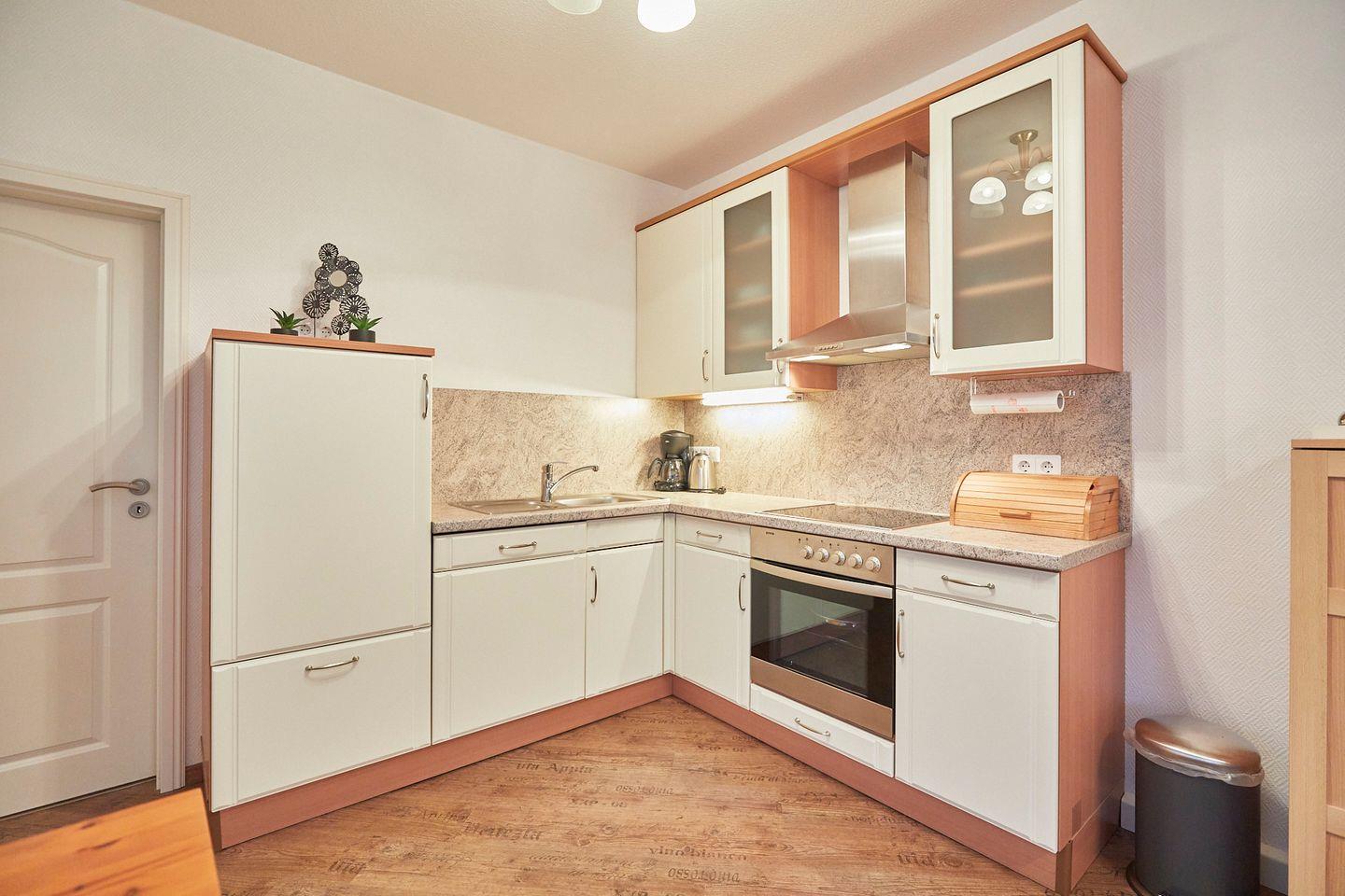 Die Ferienwohnung verfügt über ein helles Schlafzimmer mit einem bequemen Bett, das Ihnen erholsame Nächte garantiert. Der offene Wohnbereich ist mit einer modernen Küche ausgestattet, die keine Wünsche offen lässt. Hier finden Sie einen Herd mit Cerankochfeld, einen Backofen, eine Spülmaschine sowie alle notwendigen Küchenutensilien. Genießen Sie Ihre Mahlzeiten am Esstisch oder entspannen Sie auf der Sofaecke, während Sie Ihren Lieblingsfilm auf dem digitalen TV ansehen. Selbstverständlich steht Ihnen auch WLAN zur Verfügung, sodass Sie stets verbunden sind.