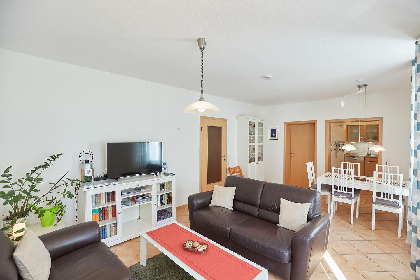 Die stilvolle Wohnung befindet sich im Erdgeschoss und überzeugt durch ihre moderne Ausstattung. Eine offene Küche, die perfekt in das helle Wohnzimmer integriert ist, lädt dazu ein, gemeinsame Mahlzeiten zu genießen. Hier stehen Ihnen alle notwendigen Geräte zur Verfügung: ein Cerankochfeld, ein Backofen, eine Mikrowelle und eine Spülmaschine sind nur einige Highlights. Genießen Sie Ihr Frühstück am Esstisch oder entspannen Sie in der bequemen Sofaecke, während Sie einen Film auf dem digitalen Fernseher schauen oder ein gutes Buch lesen.