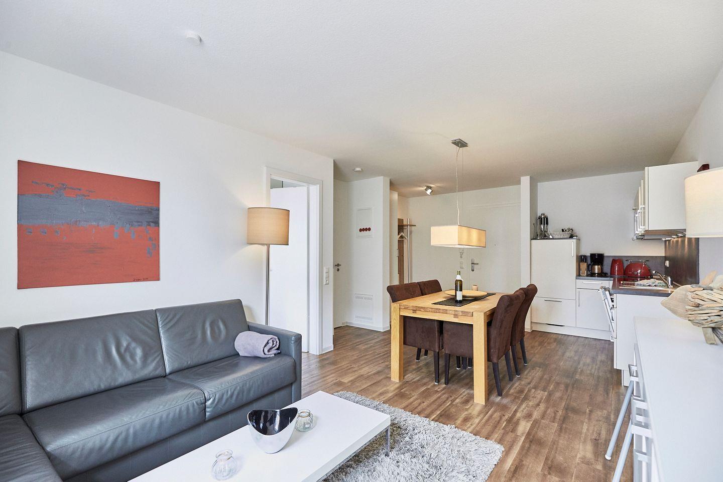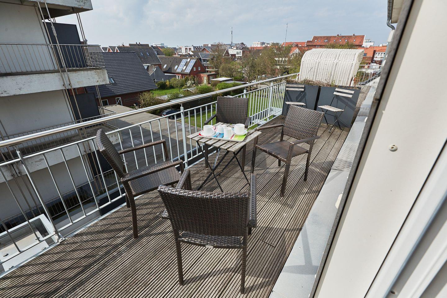 Moderne Ferienwohnung im Ortskern von Borkum mit Balkon und Nähe zum Strand, ideal für erholsame Nordseeurlaube.