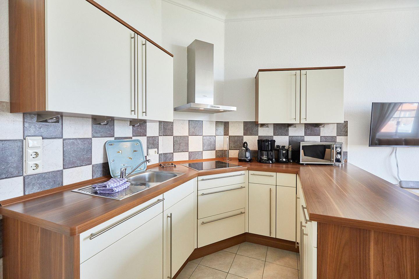 Eine vollständig ausgestattete, offene Küche macht es Ihnen leicht, Ihre Lieblingsgerichte zuzubereiten. Sie finden alles, was Sie benötigen, von einem Cerankochfeld über eine Mikrowelle bis hin zu einer Spülmaschine, um Ihren Aufenthalt so angenehm wie möglich zu gestalten. Genießen Sie Ihre Mahlzeiten auf der gemeinschaftlichen Terrasse, die mit Gartenmöbeln ausgestattet ist und ausreichend Platz für entspannte Stunden im Freien bietet – der ideale Ort, um zu Verweilen.
