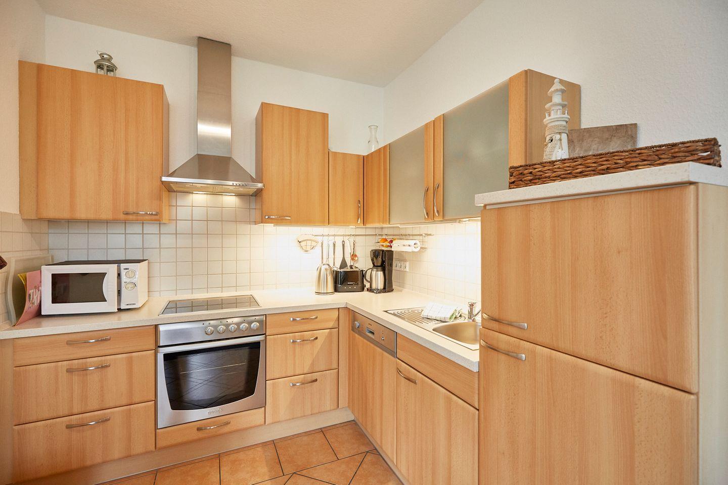 Die offene Küche, die nahtlos in den Essbereich übergeht, bietet Ihnen die Freiheit, Ihre Lieblingsgerichte zuzubereiten. Ausgestattet mit modernen Kochgeräten wie einem 4-Platten-Herd, Mikrowelle, Spülmaschine und Kühlschrank mit Gefrierfach, lässt die Ausstattung keine Wünsche offen. Auch die notwendigen Küchenutensilien sind vorhanden, damit Sie in Ihrer „Heimat auf Zeit“ ein gemütliches Dinner zaubern können. Der Esstisch im Herzen der Wohnung schafft Raum für gesellige Abende und gemeinsames Essen.