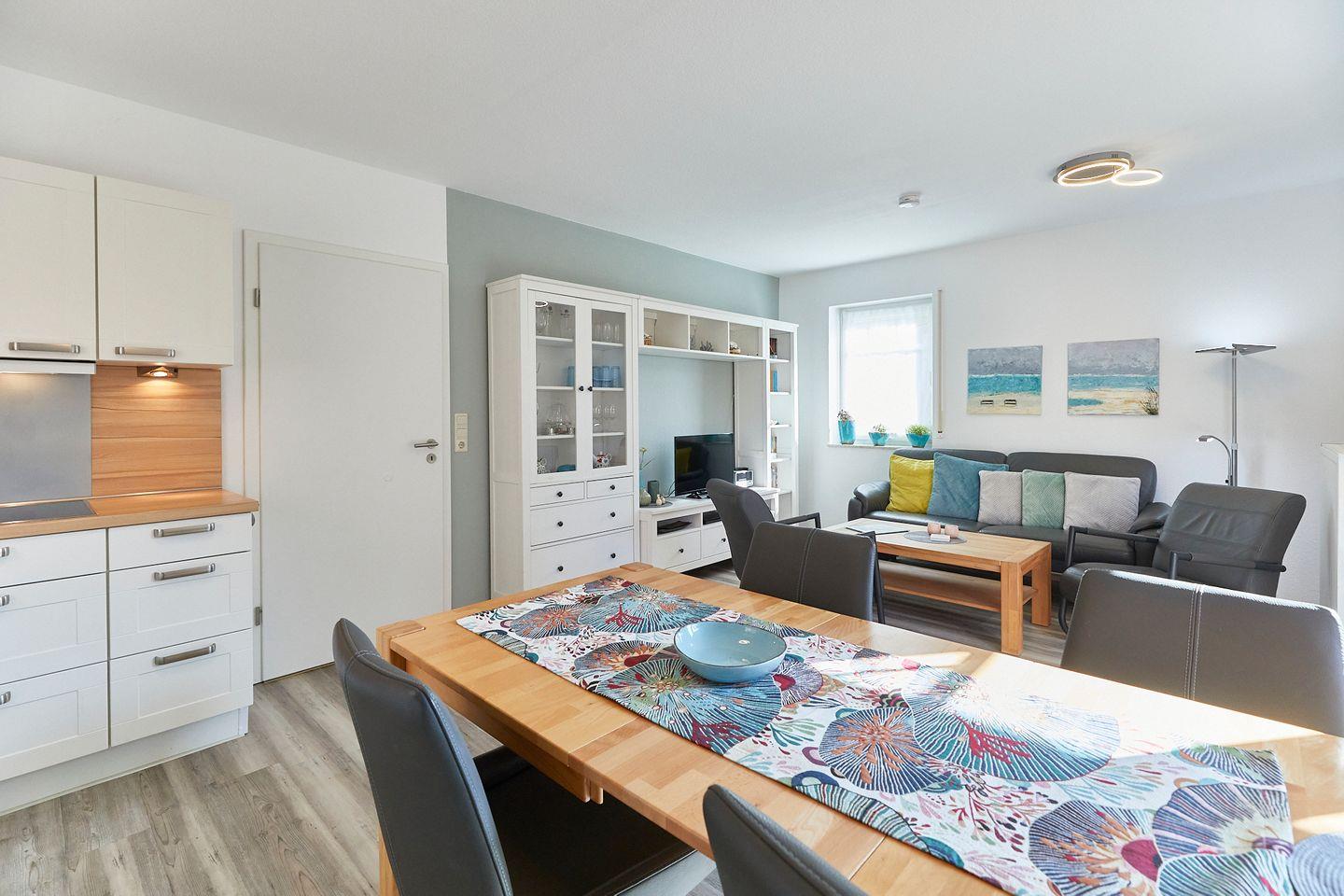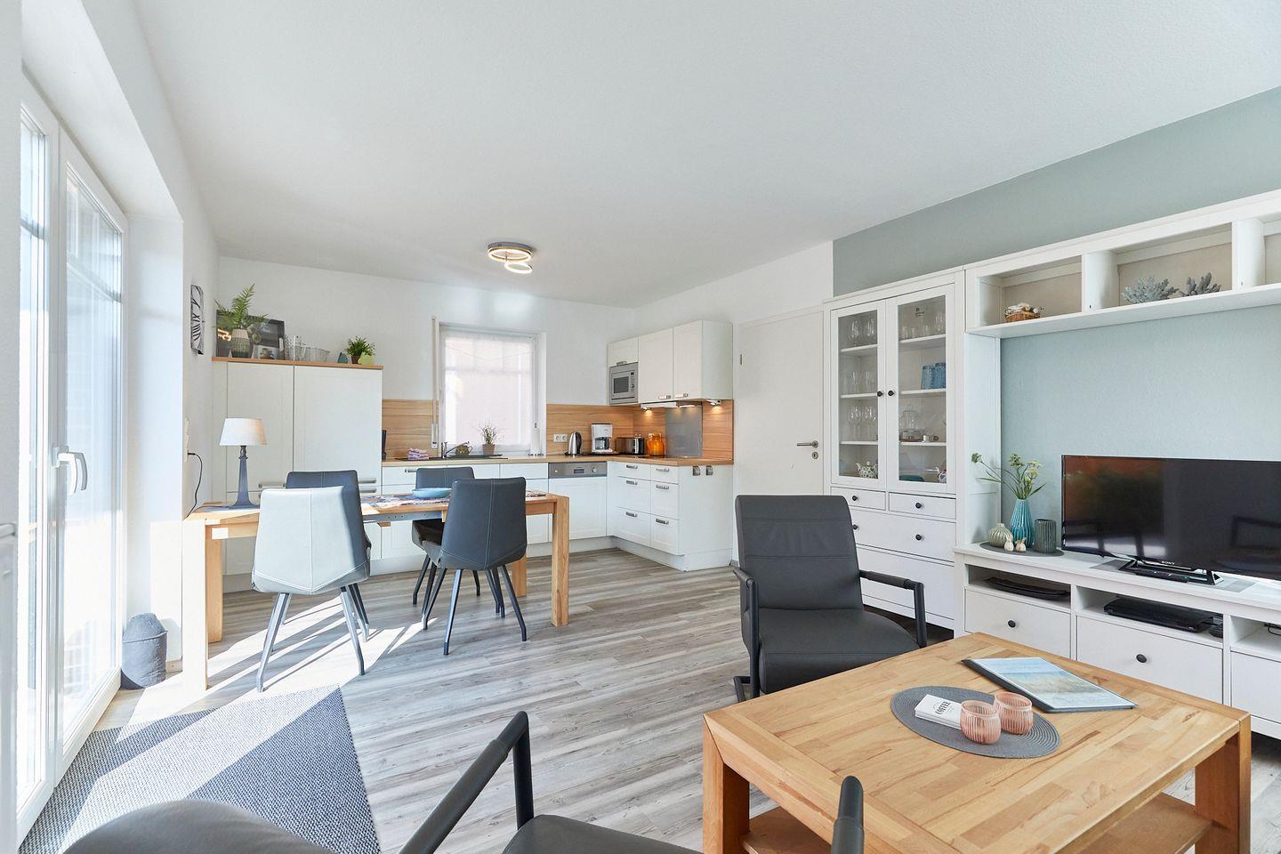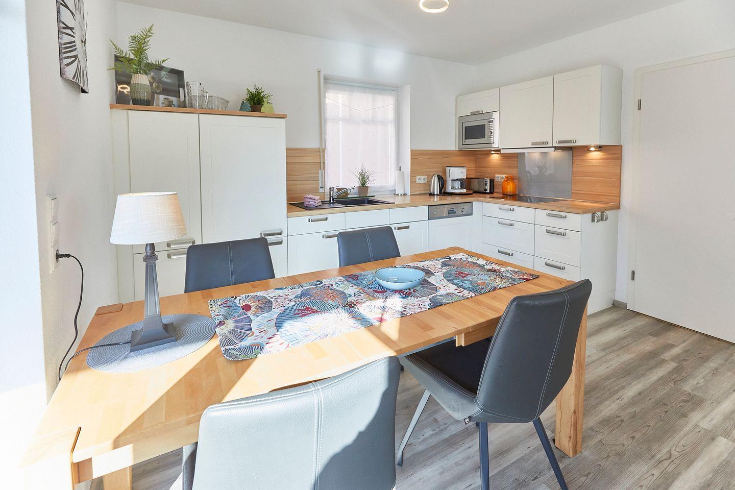 Betreten Sie die Ferienwohnung und genießen Sie die helle und freundliche Atmosphäre, die durch den offenen Wohnbereich mit einer modernen Küche und einem gemütlichen Essbereich geprägt wird. Hier finden Sie alles, was Sie benötigen, um schmackhafte Mahlzeiten zuzubereiten, darunter einen Ceranfeldherd, einen Kühlschrank mit Gefrierfach, eine Mikrowelle sowie eine Spülmaschine. Ob Frühstück auf der Terrasse oder ein entspanntes Dinner – Sie haben zahlreiche Möglichkeiten, Ihre kulinarischen Wünsche zu verwirklichen.