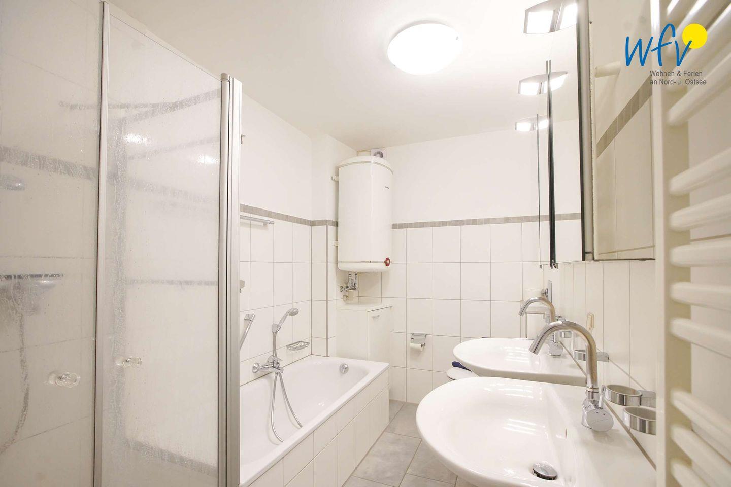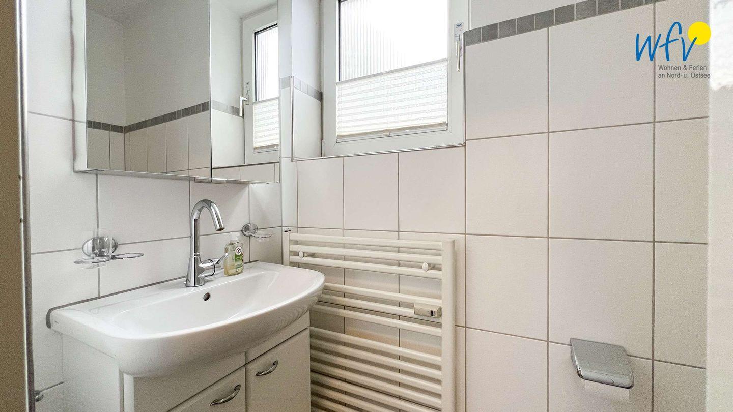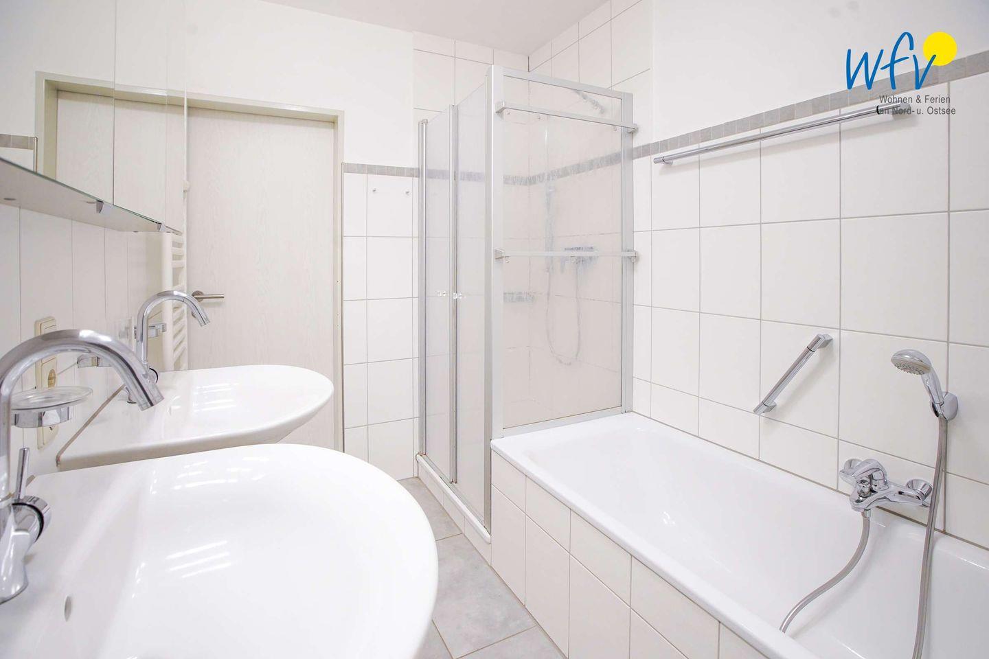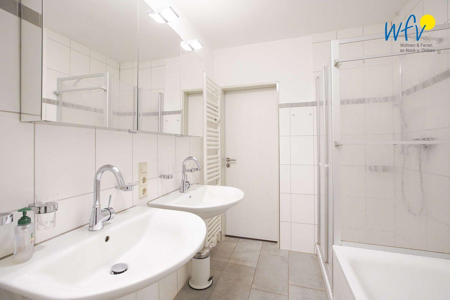 Nach einem Tag an der frischen Nordseeluft können Sie im geräumigen Badezimmer mit zwei großen Waschtischen, Badewanne und separater Dusche in Ruhe abschalten, das kleine Gästebad entspannt dabei die täglichen Badezimmer-Routinen.