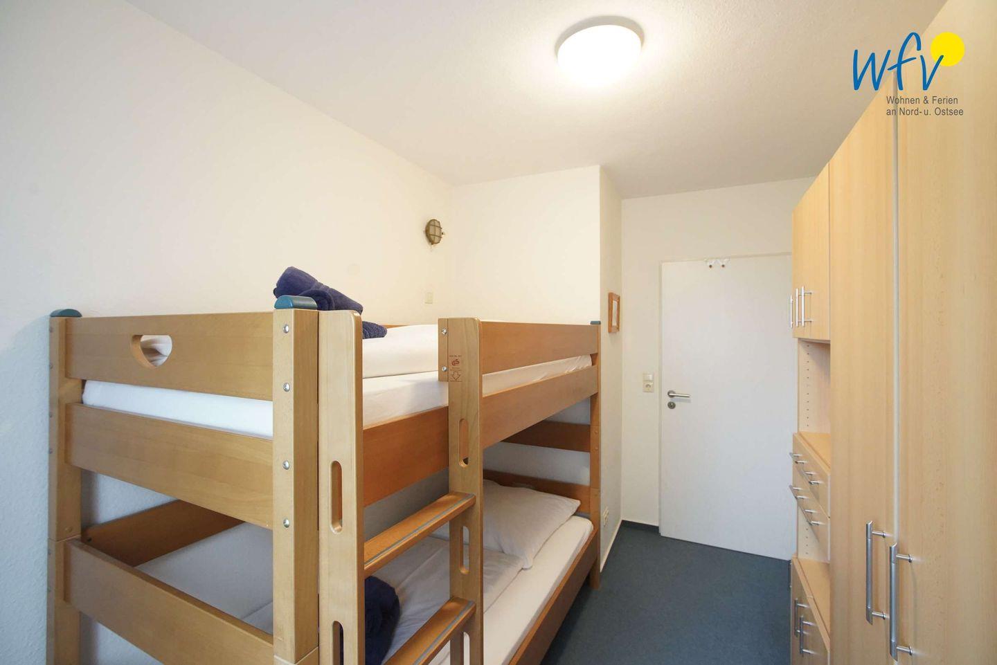Die separaten Schlafzimmer bieten angenehme Rückzugsmöglichkeiten und sind jeweils mit kleinen Schreibgelegenheiten ausgestattet. Das Elternschlafzimmer ist mit einem Doppelbett (je 100 x 200 cm), das Kinderschlafzimmer mit einem Etagenbett (90 x 200) eingerichtet. Weitere Personen können auf der vollwertigen Doppel-Schlafcouch im Wohnraum Platz finden. Alle Zimmer verfügen über Verdunkelungsvorhänge für eine angenehme Nachtruhe.