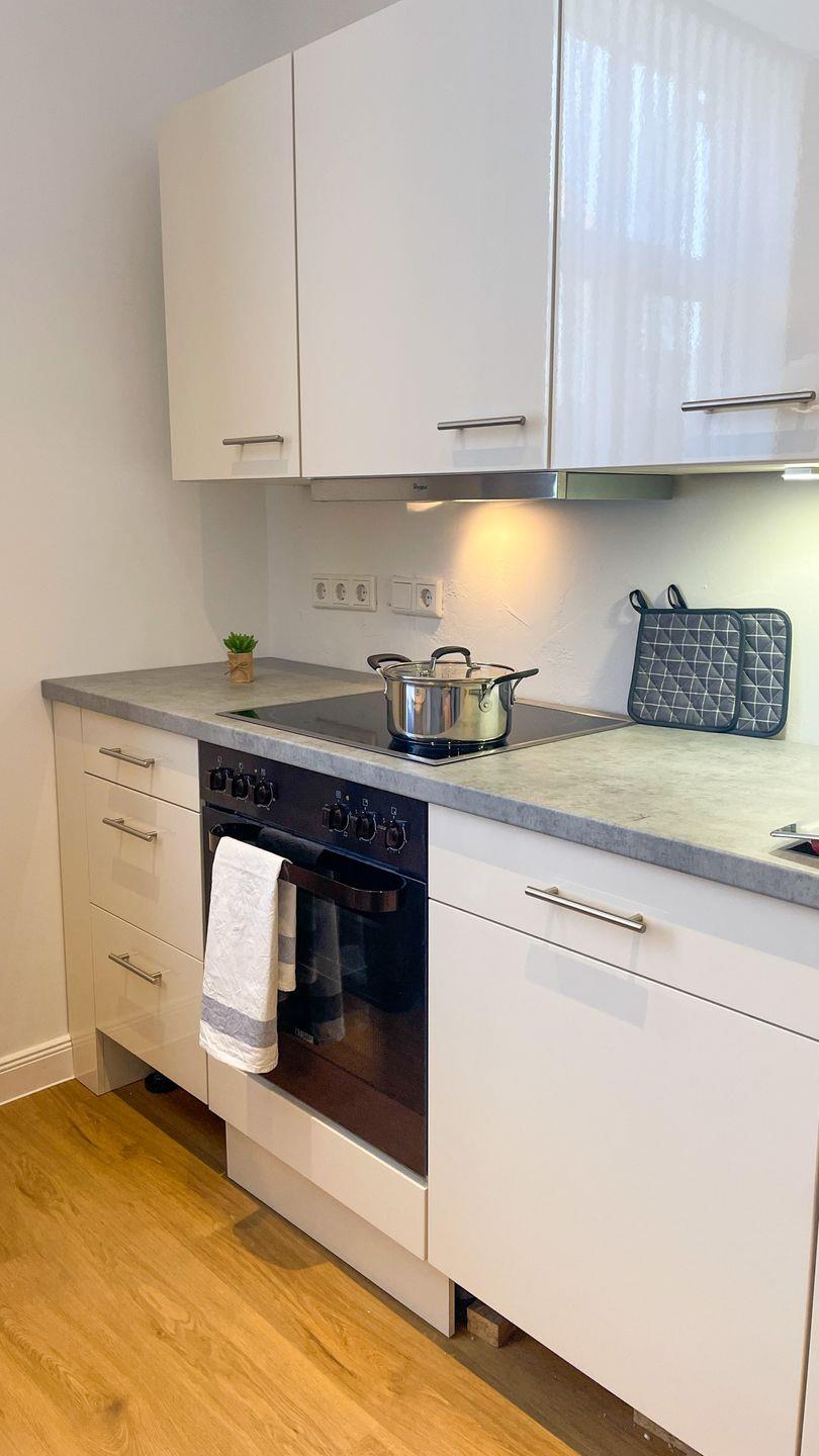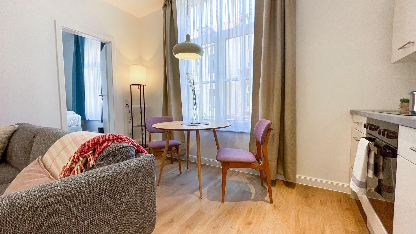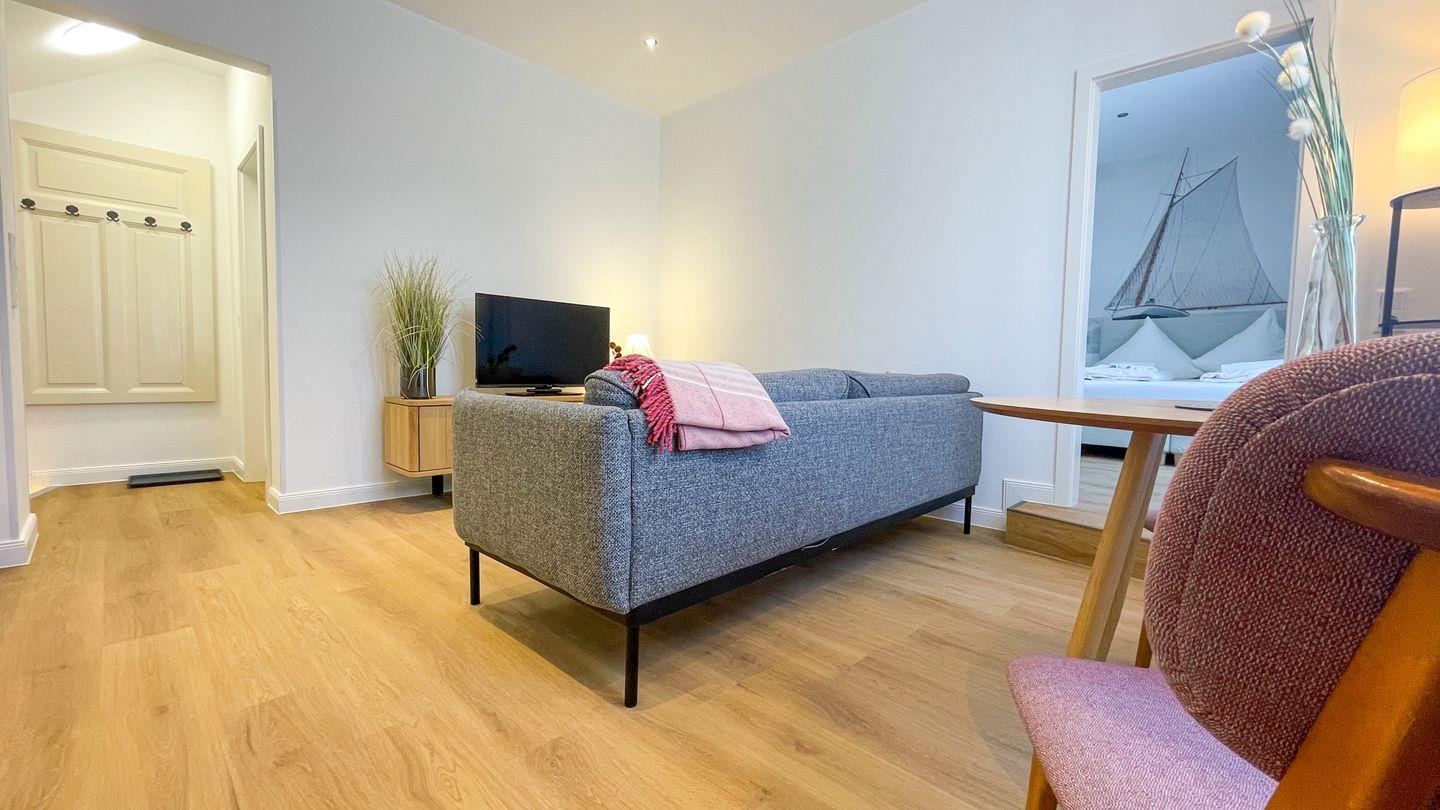 Der Wohnbereich ist hell gestaltet und lädt dazu ein, den Tag in Ruhe ausklingen zu lassen. Die Küche ist in den Wohnraum integriert und vollständig ausgestattet. Das separate Schlafzimmer bietet eine ruhige Rückzugsmöglichkeit.