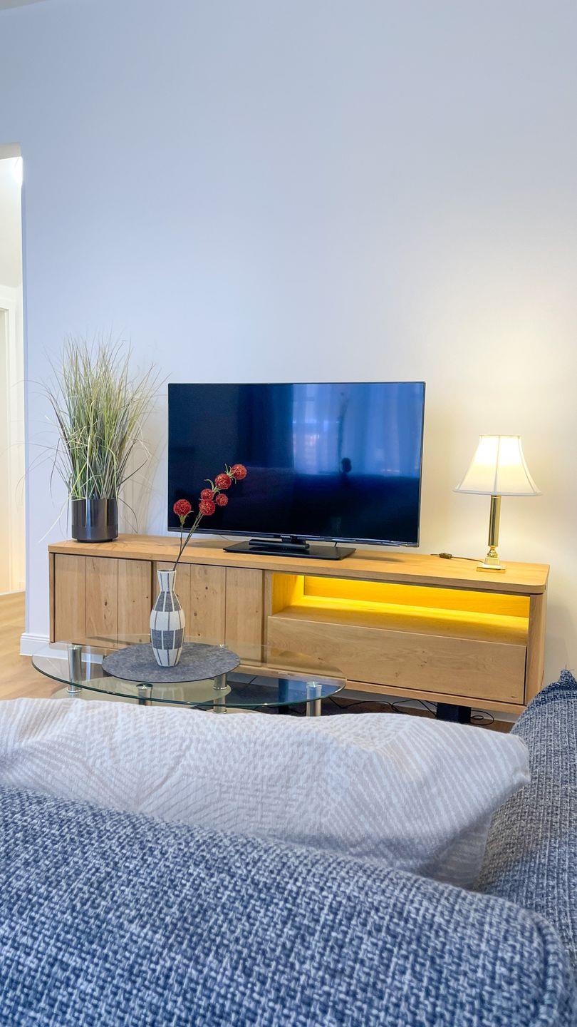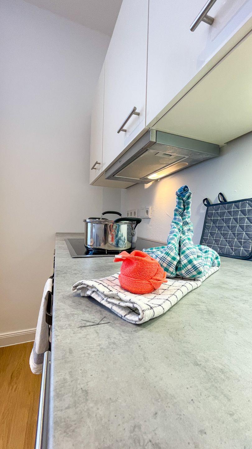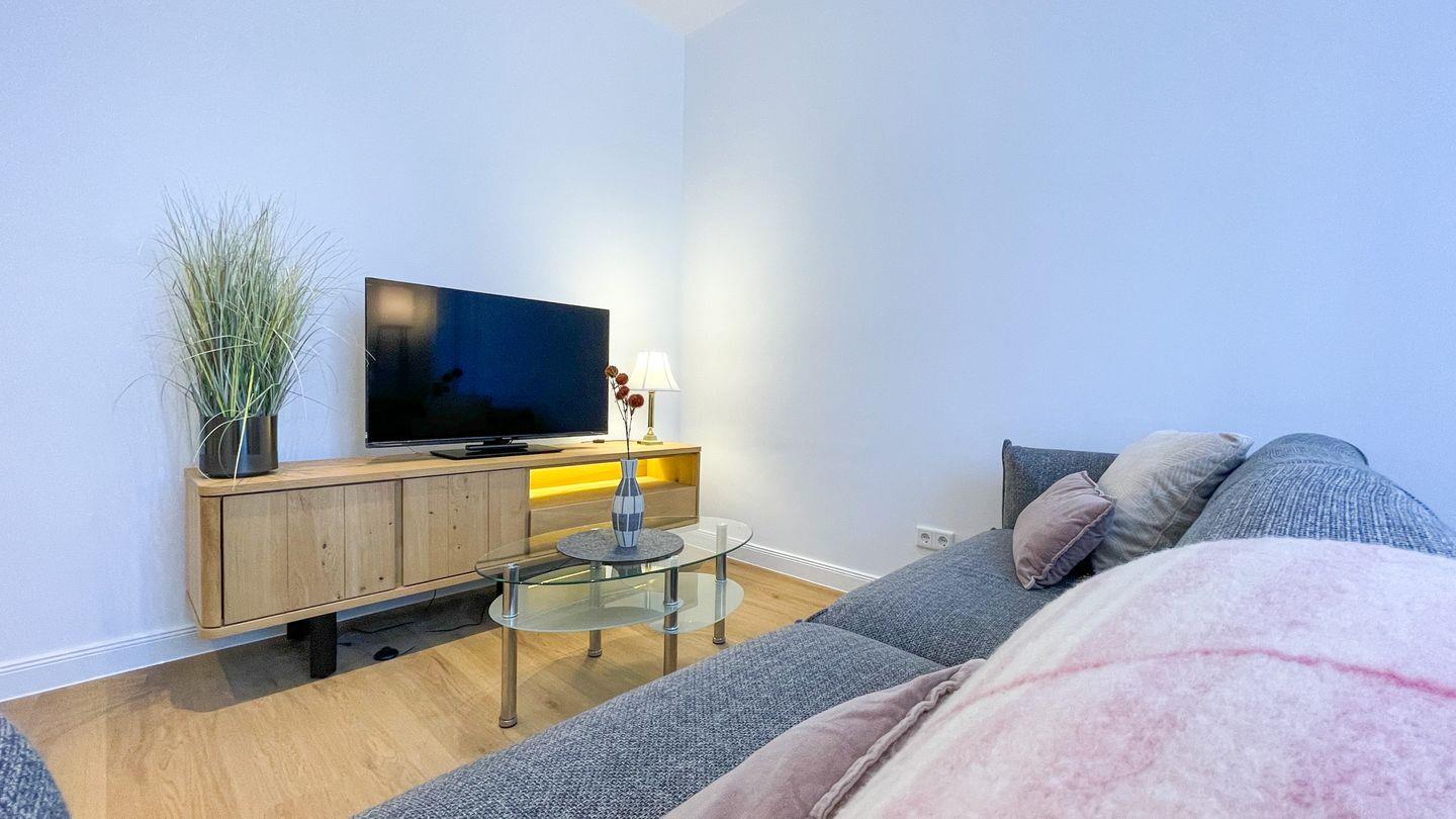 Der Wohnbereich ist hell gestaltet und lädt dazu ein, den Tag in Ruhe ausklingen zu lassen. Die Küche ist in den Wohnraum integriert und vollständig ausgestattet. Das separate Schlafzimmer bietet eine ruhige Rückzugsmöglichkeit.