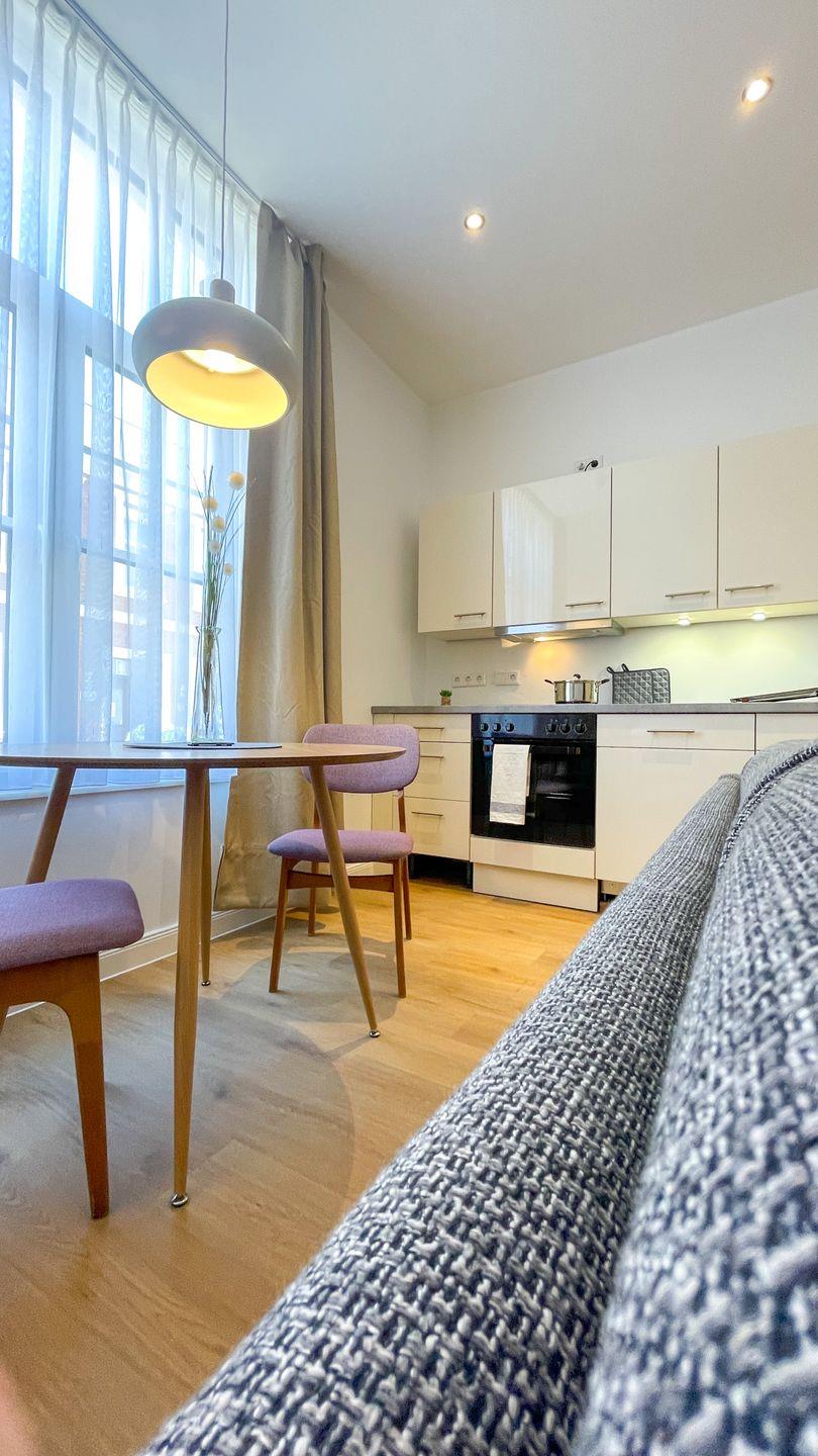 Sie bietet einen hellen Wohnbereich, ein separates Schlafzimmer sowie eine integrierte Küche. Haustierfrei, ruhig gelegen und zentral im Ortskern von Borkum.