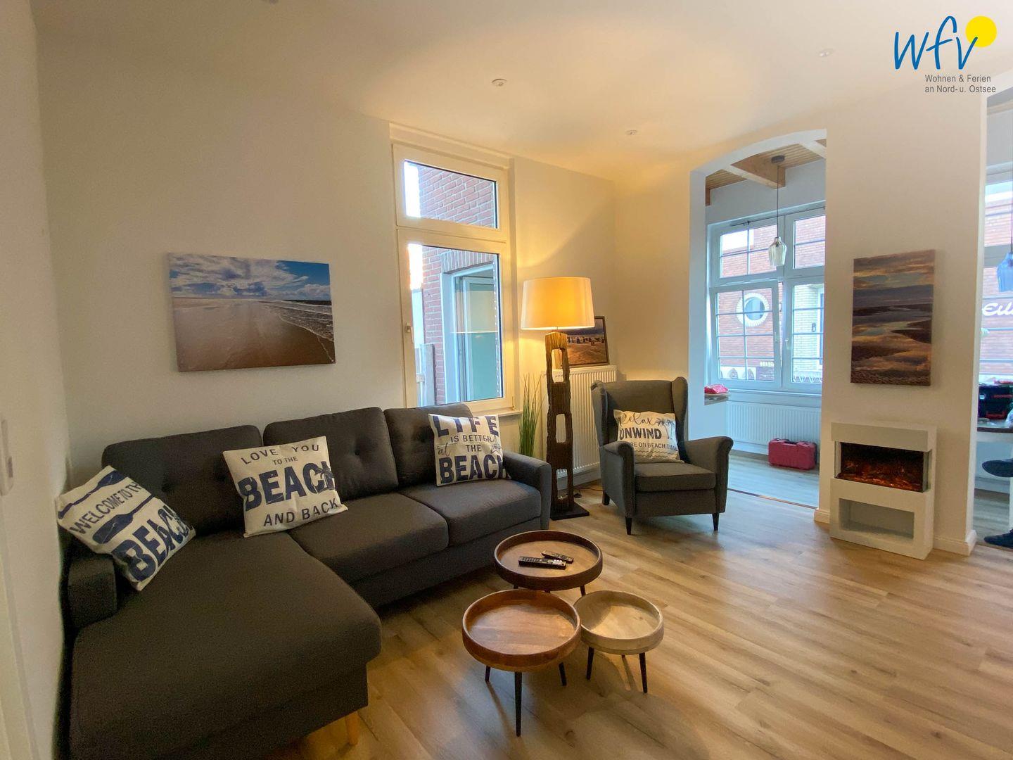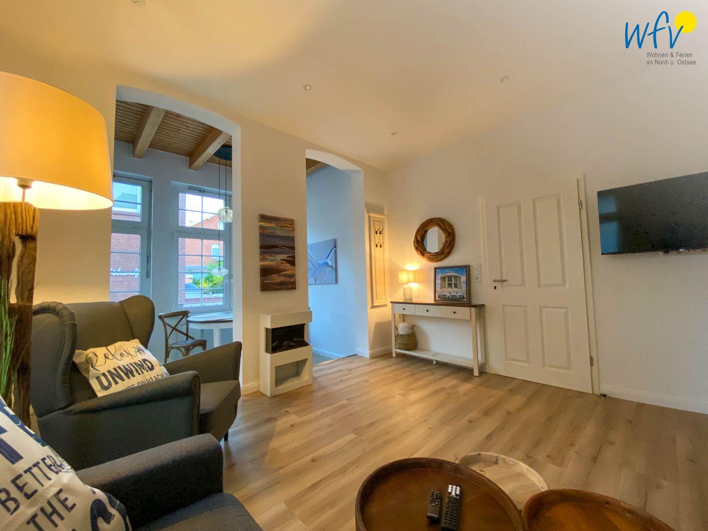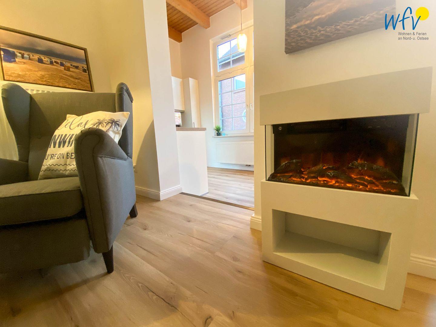 Die Sofalandschaft mit Relaxsessel, einem 43 Zoll-Fernseher und Elektrokamin laden auch im Winter zum Entspannen ein. Genießen Sie diese Wohlfühloase nach langen Strandspaziergängen im Sommer, wie im Winter mit einem heißen Ostfriesentee!