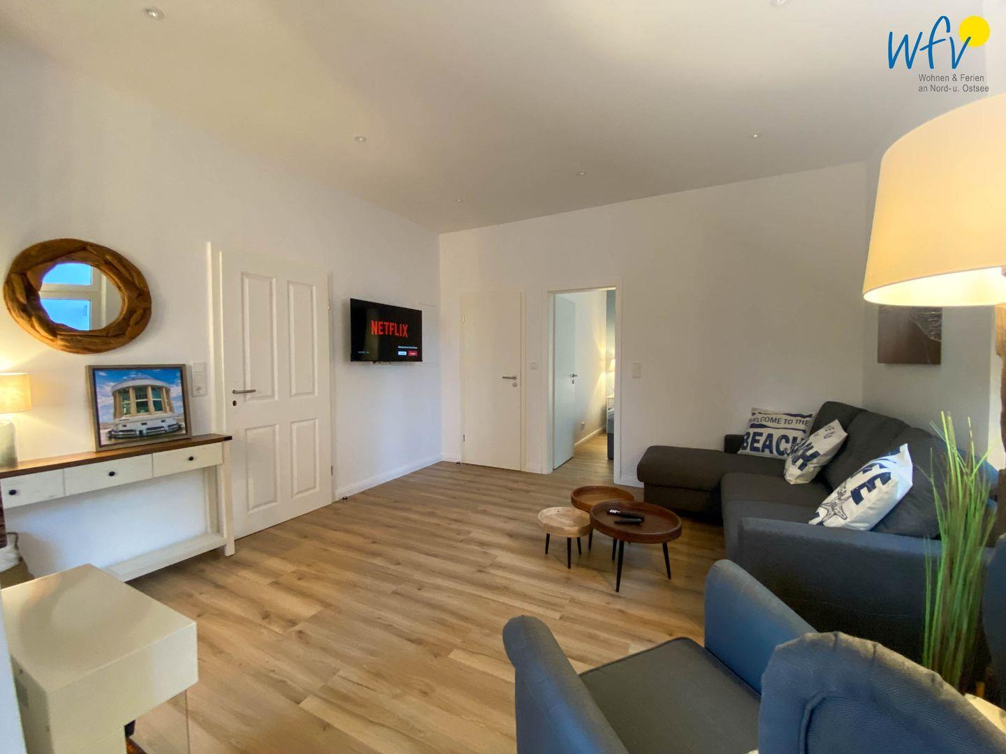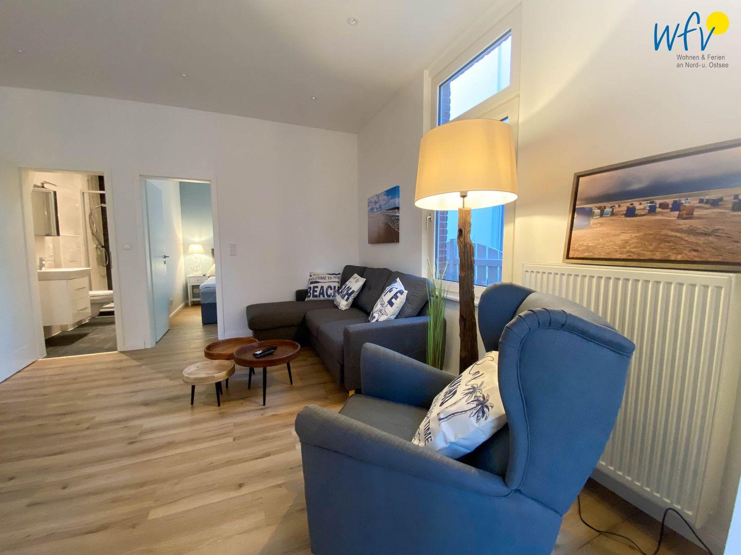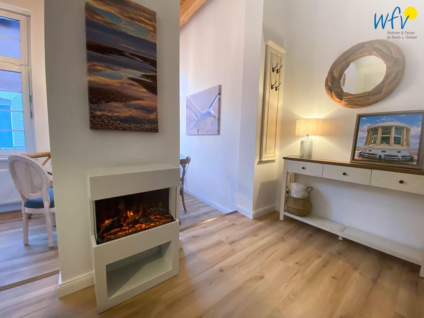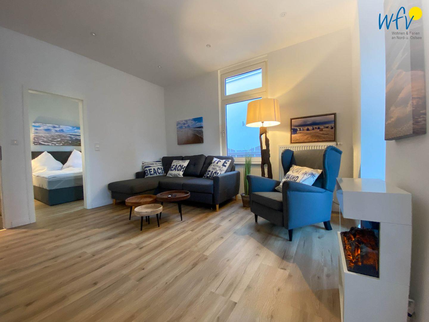Die Sofalandschaft mit Relaxsessel, einem 43 Zoll-Fernseher und Elektrokamin laden auch im Winter zum Entspannen ein. Genießen Sie diese Wohlfühloase nach langen Strandspaziergängen im Sommer, wie im Winter mit einem heißen Ostfriesentee!