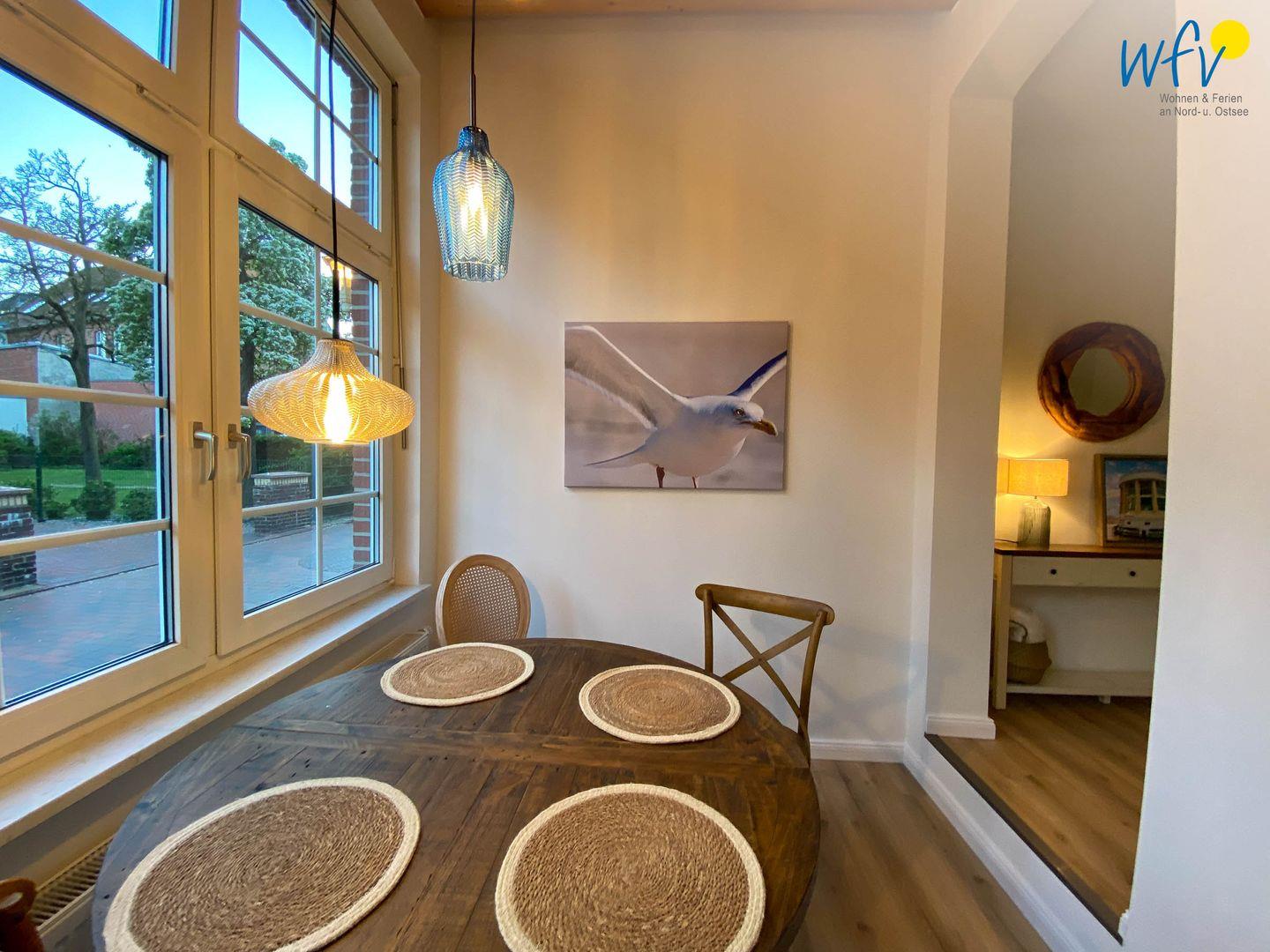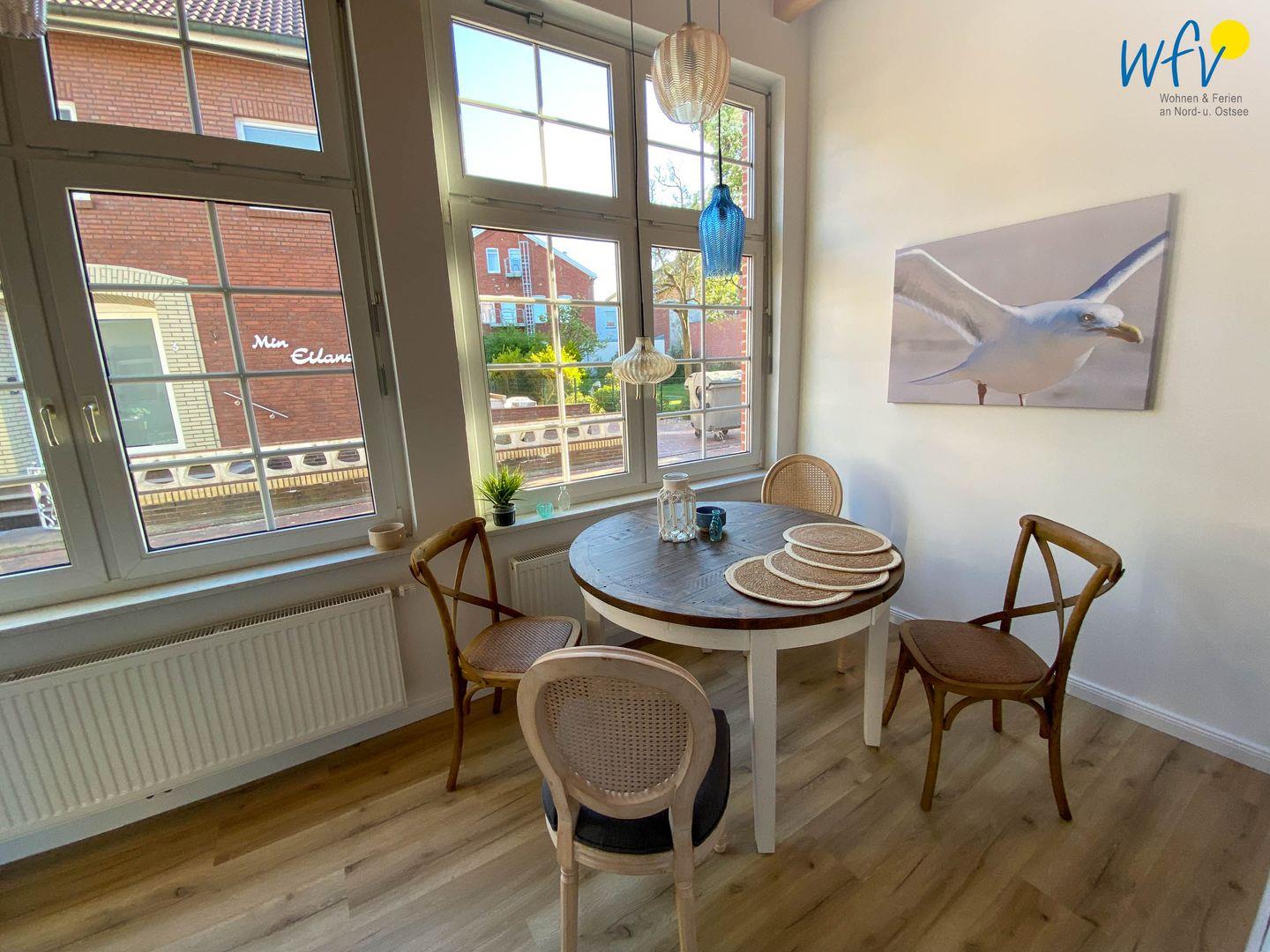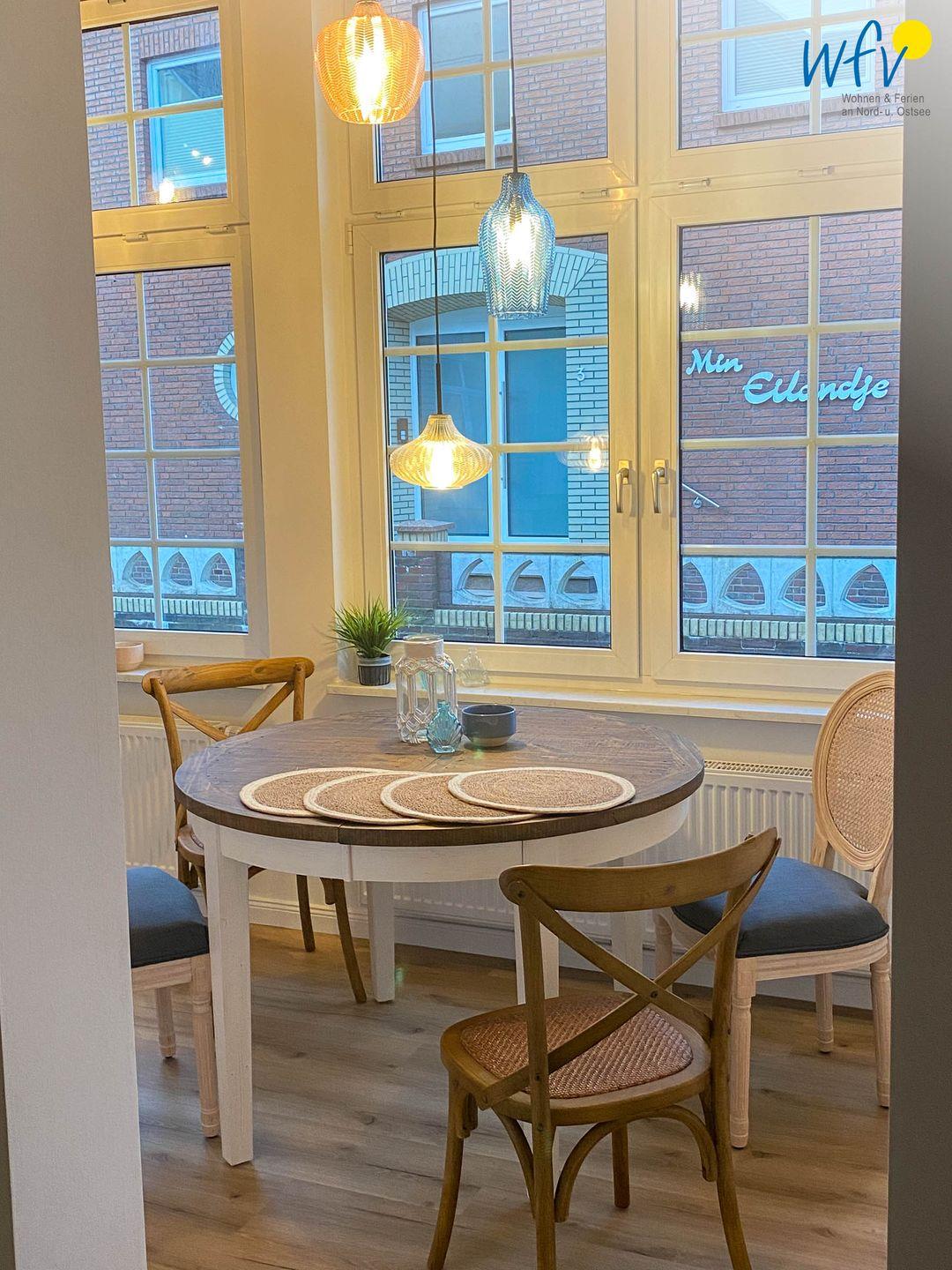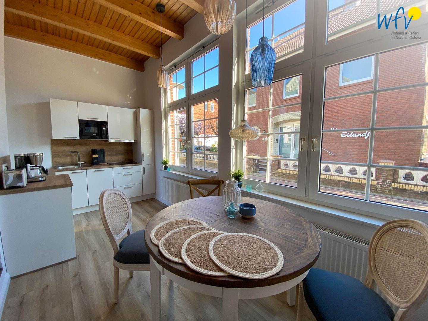 Die Ferienwohnung erstreckt sich über eine großzügige Fläche und liegt im rechten Erdgeschoss des Hauses. Durch den offen gestalteten Wohnbereich, die hohen Decken und die Torbögen erhält man einen herrlichen, licht durchflutenden Blick in die für Borkum typische, nach Süden ausgerichtete Veranda. In dieser befindet sich die Küche mit einem einladenden Essbereich. Die gut ausgestattete Küche lädt dazu ein, kulinarische Köstlichkeiten zuzubereiten. Sie finden hier alles, was Sie benötigen - vom Induktionsherd über Mikrowelle bis hin zum Kühlschrank.