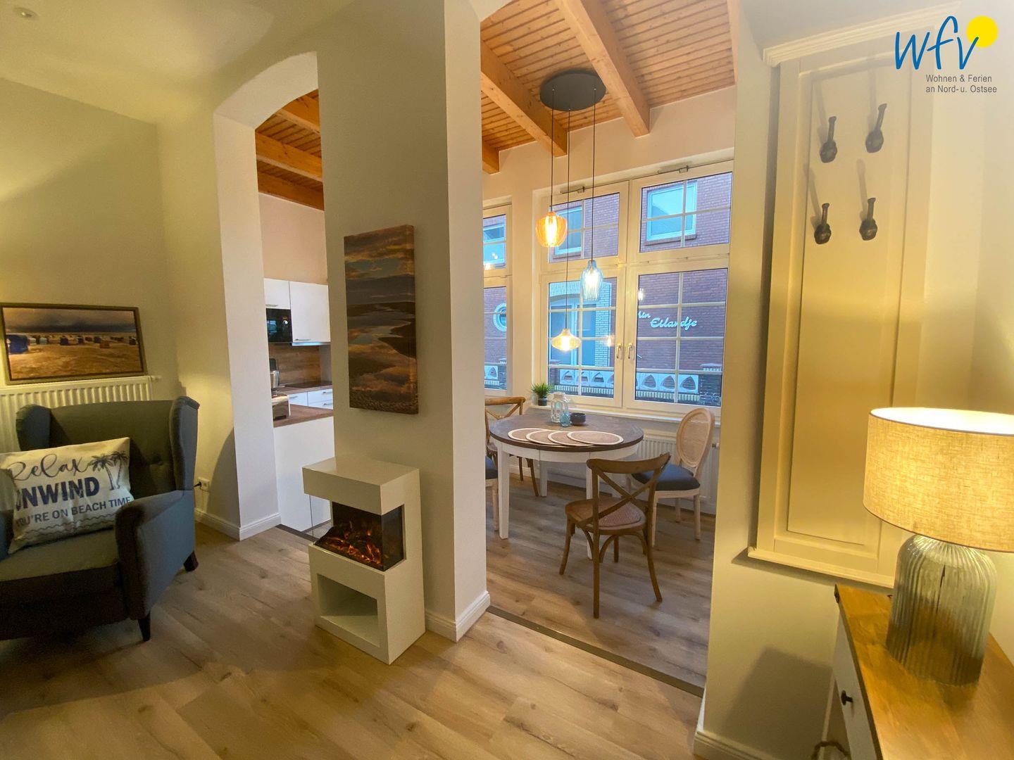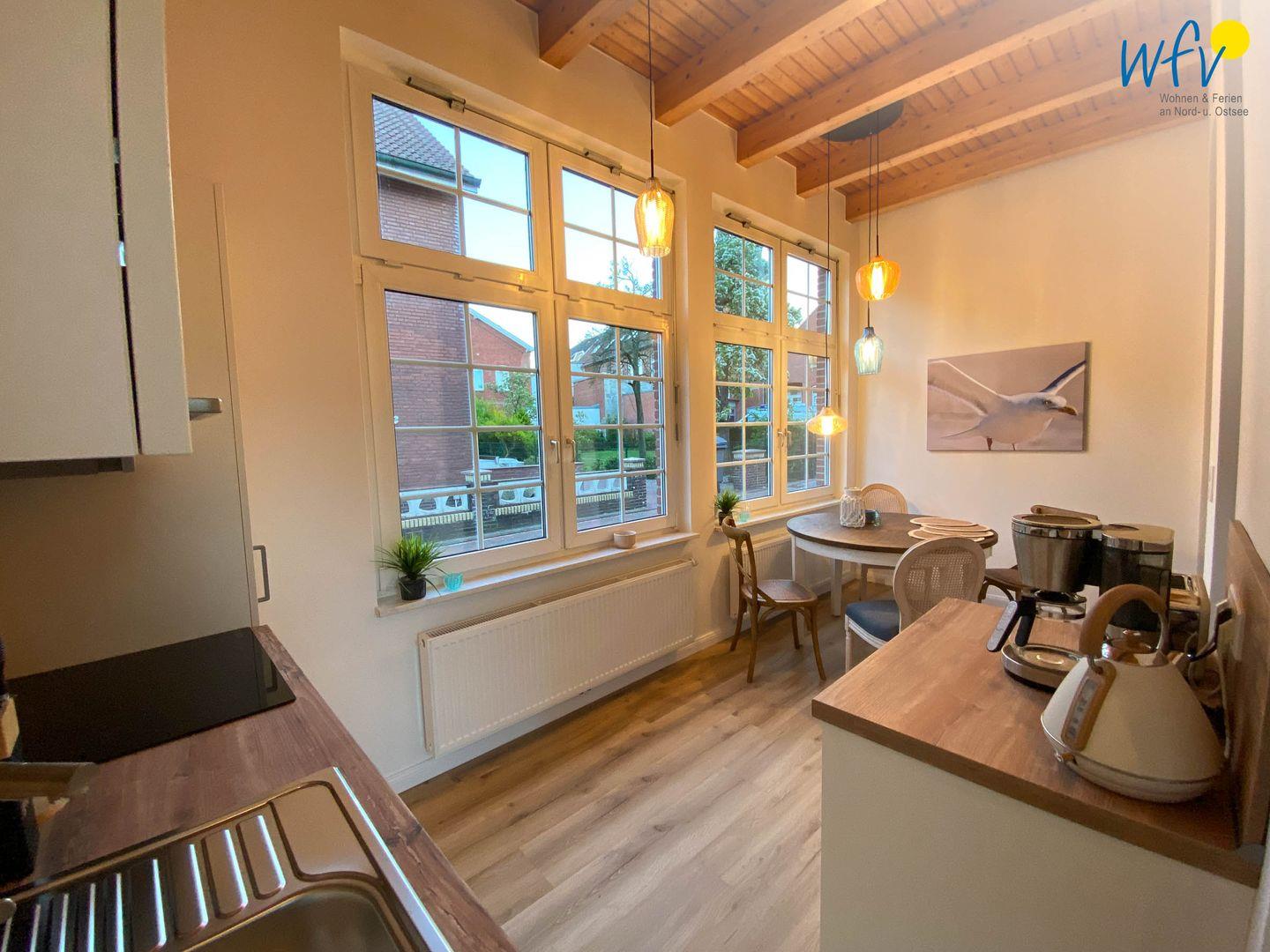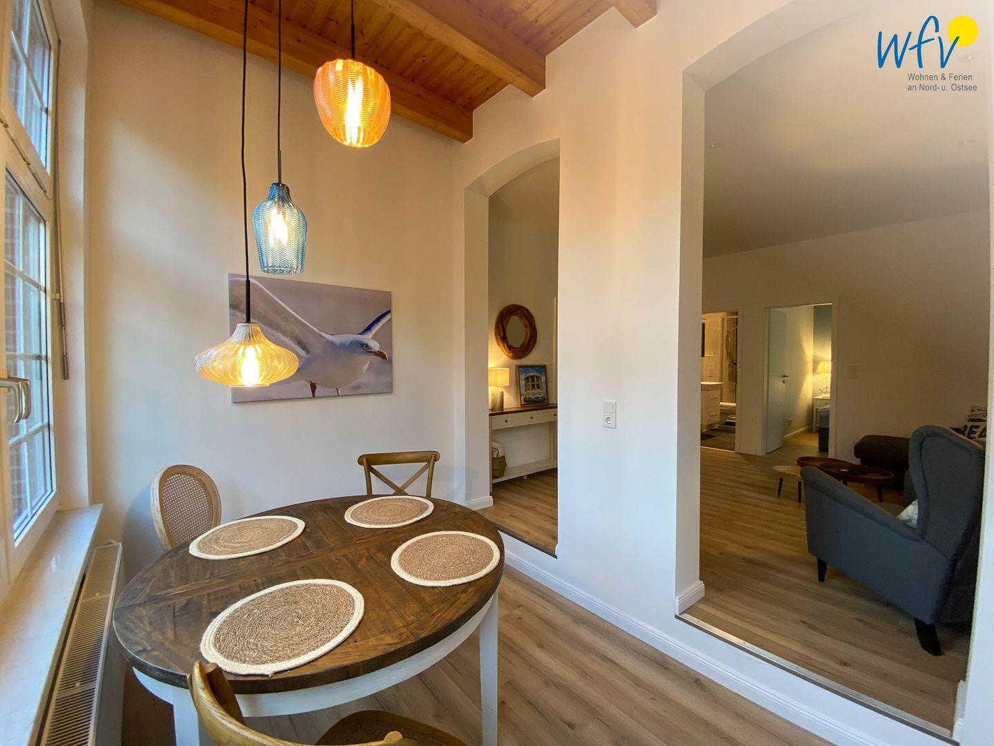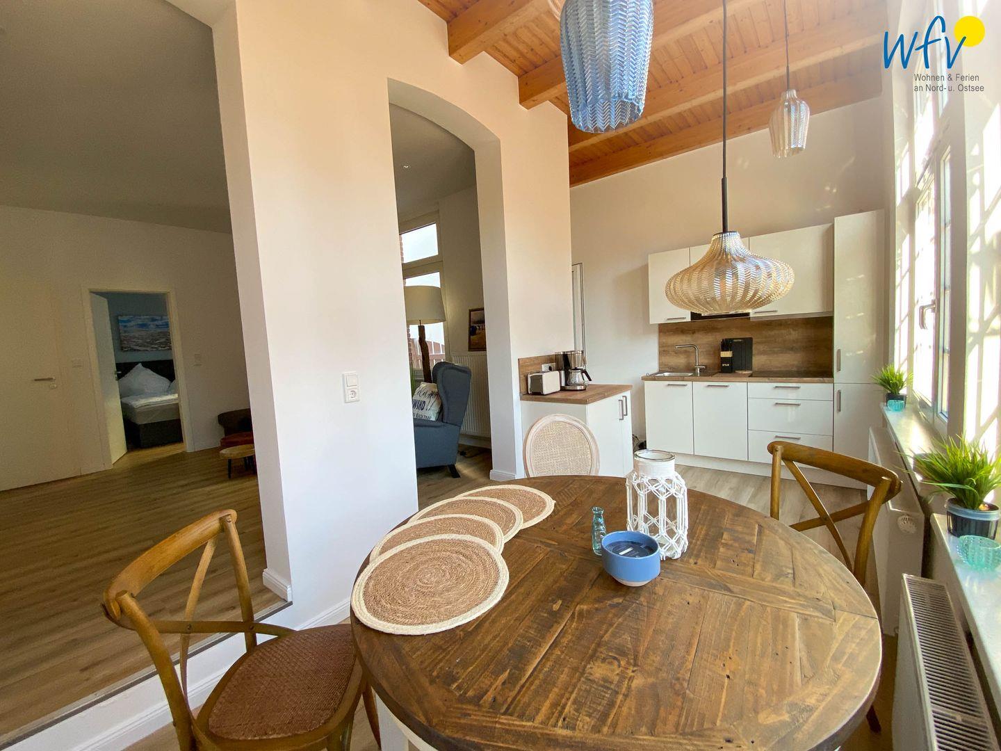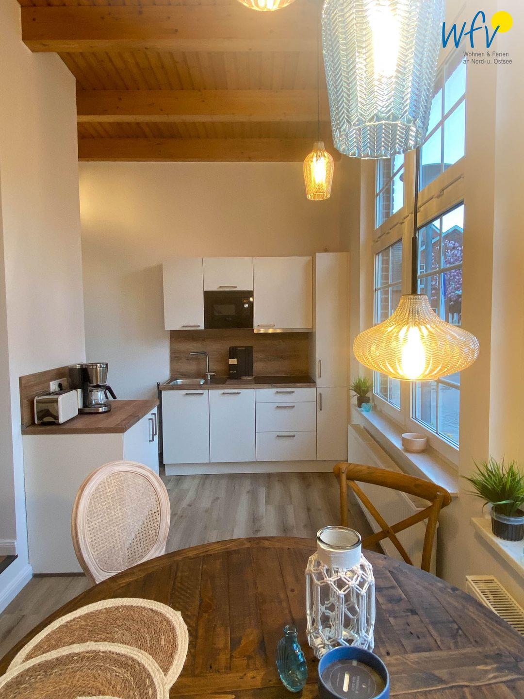 Die Ferienwohnung erstreckt sich über eine großzügige Fläche und liegt im rechten Erdgeschoss des Hauses. Durch den offen gestalteten Wohnbereich, die hohen Decken und die Torbögen erhält man einen herrlichen, licht durchflutenden Blick in die für Borkum typische, nach Süden ausgerichtete Veranda. In dieser befindet sich die Küche mit einem einladenden Essbereich. Die gut ausgestattete Küche lädt dazu ein, kulinarische Köstlichkeiten zuzubereiten. Sie finden hier alles, was Sie benötigen - vom Induktionsherd über Mikrowelle bis hin zum Kühlschrank.
