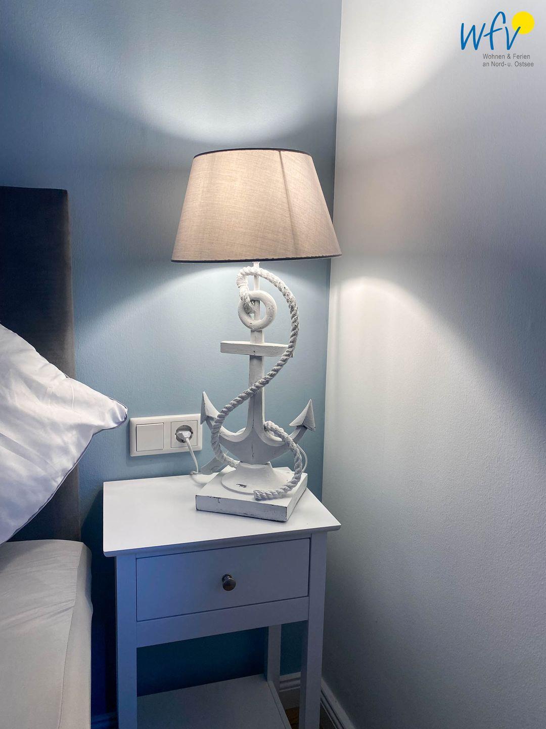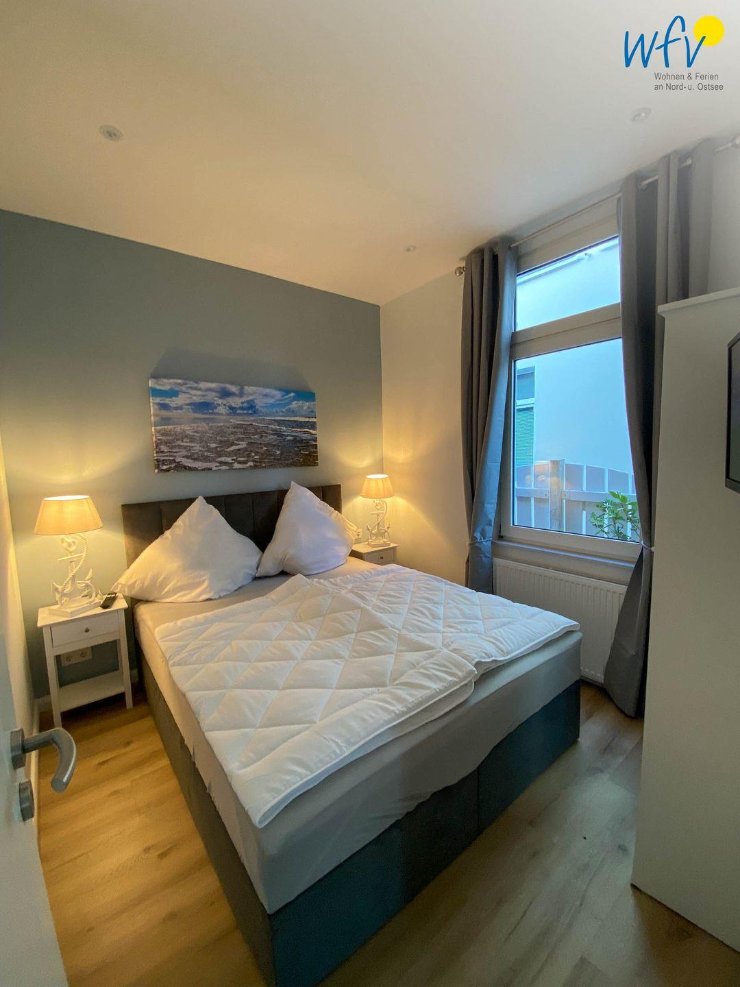 Das dem Wohnbereich angrenzende, gemütliche Schlafzimmer mit 7-Zonen-Taschenmatratzen-Boxspringbett mit Topper (160 x 200 cm), Verdunklung und internetfähigem Fernseher lädt zum Verweilen ein und verspricht erholsame Nächte. Genügend Stauraum bieten neben dem Kleiderschrank die beidseitig leicht aufstellbaren, geräumigen Bettkästen des Boxspringbettes.