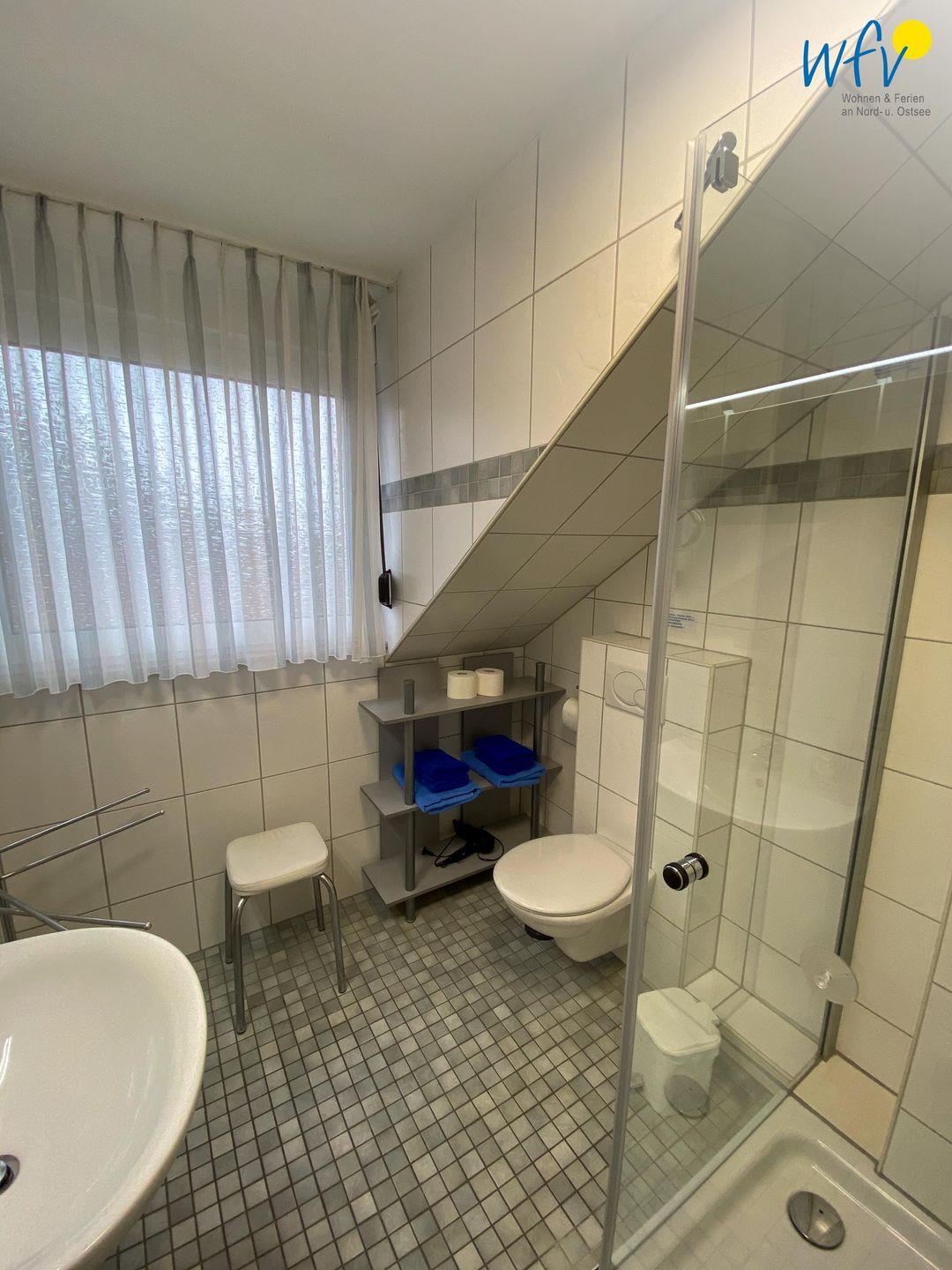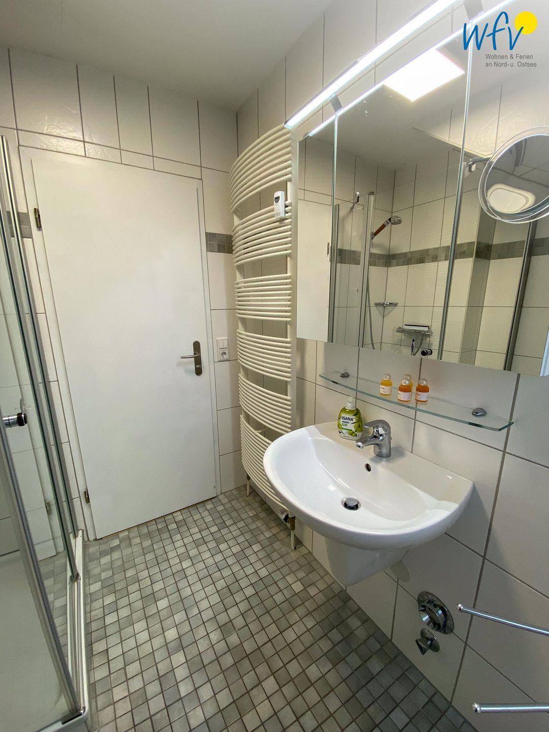 Das gepflegte Tageslichtbad verfügt über Waschbecken, WC, Dusche und Handtuchheizung.