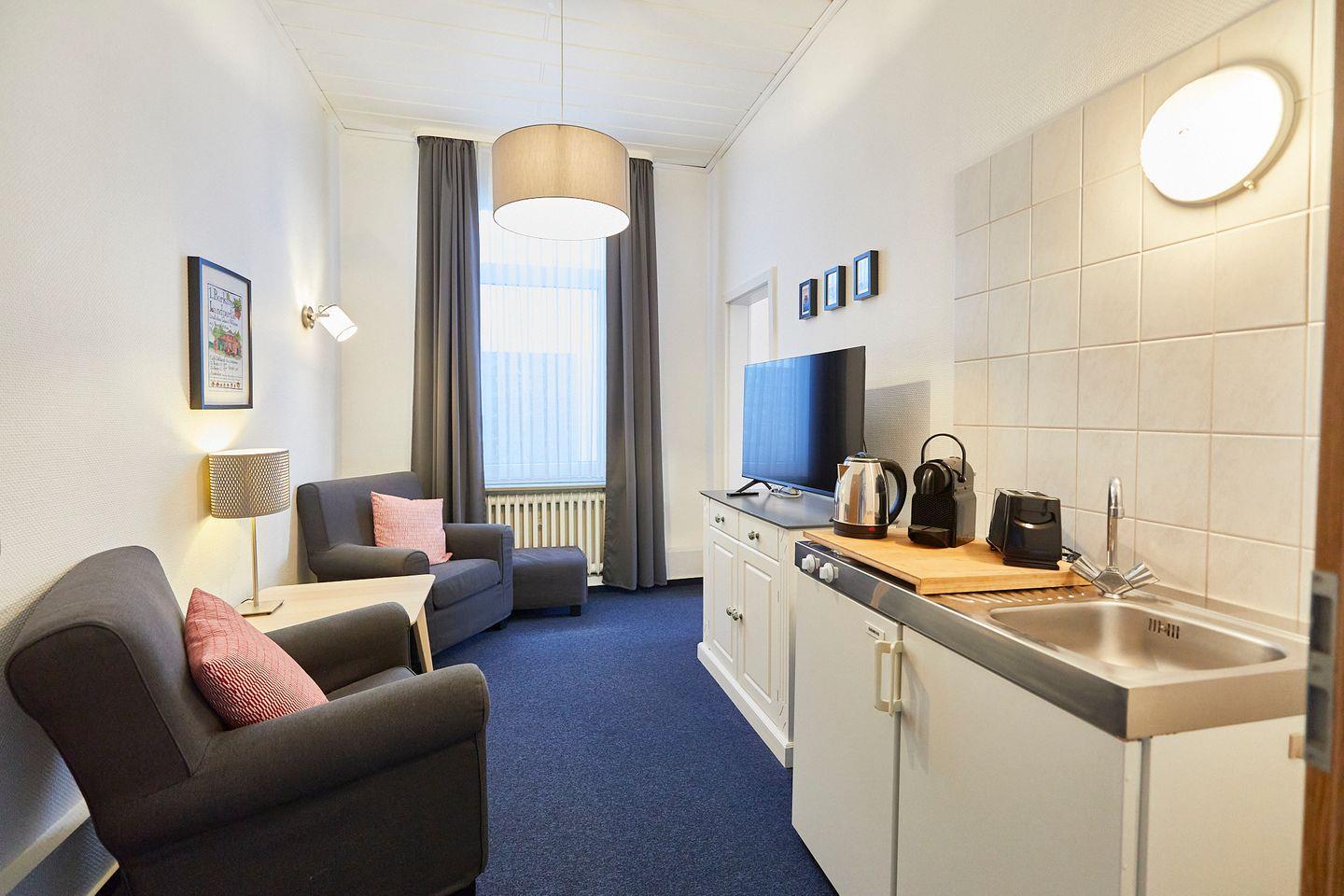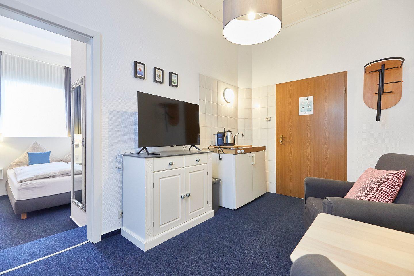 Das Studio 1 befindet sich im Erdgeschoss des Hauses, innerhalb des Appartements befindet sich eine Stufe. Ausgehend vom Wohnbereich mit zwei Fernsehsesseln, TV und einer Teeküche mit Kühlschrank gelangt man in das Schlafzimmer mit angrenzendem Duschbad. Das Schlafzimmer bietet ein gemütliches Doppelbett, Kleiderschrank und Verdunkelungsmöglichkeiten.