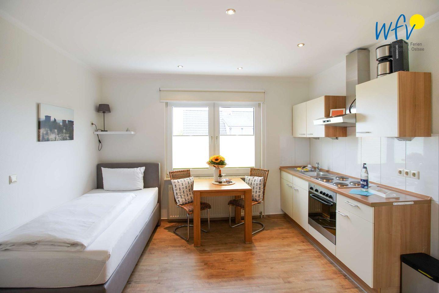 Entdecken Sie die "Ferienwohnung Koje" im "Apartmenthaus Roberta" auf Borkum - ideal für den Urlaub als Single. Die Wohnung bietet Ihnen einen gemütlichen Wohn-/Schlafraum mit offener, gut ausgestatteter Küche und komfortablem Boxspringbett sowie ein elegantes Duschbad. Ein modernes TV und freies WLAN sorgen für zusätzlichen Komfort. Wir wünschen Ihnen gute Erholung in sehr zentraler und strandnaher Lage - nur ca. 100 m und Sie sind an der Promenade!