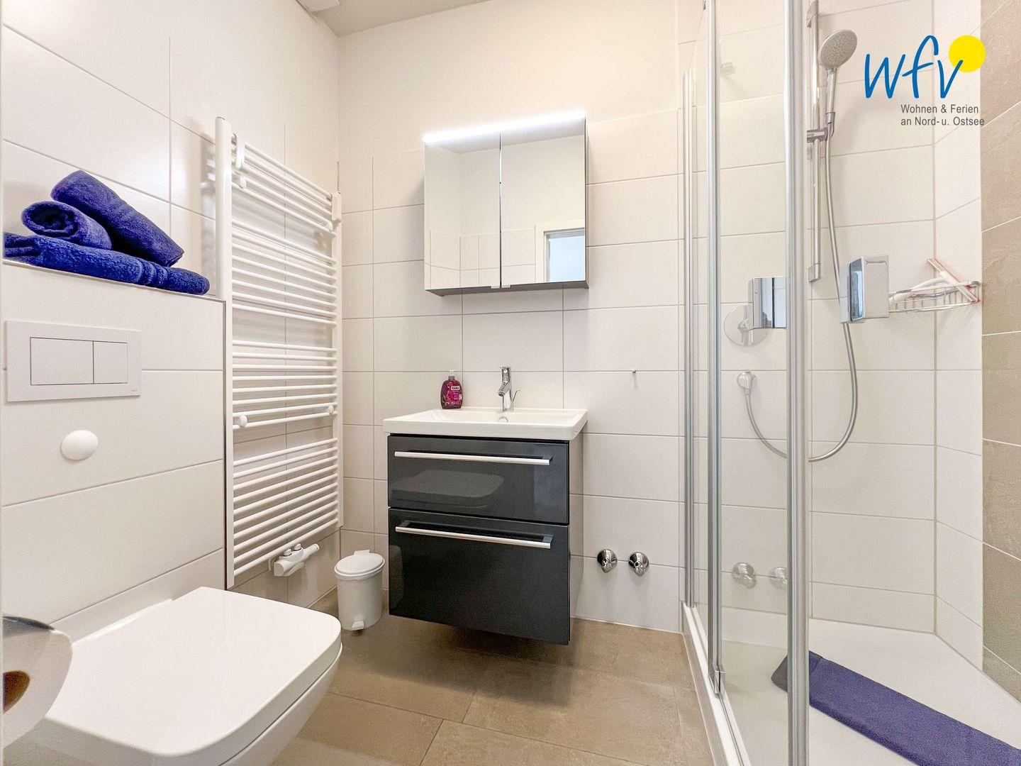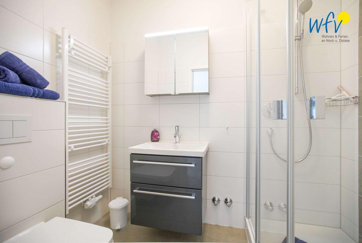 In dem kleinen modernen Badezimmer mit bodengleicher Dusche und Handtuchheizung können Sie sich nach dem Strandtag erfrischen und entspannen.