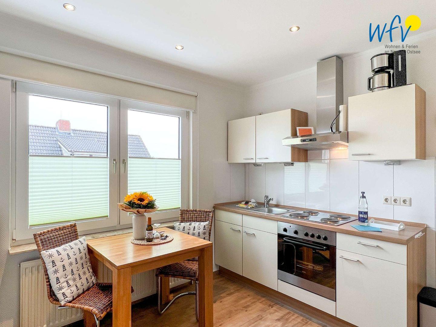 Warme Frühstücksbrötchen, kleine Snacks für den Ausflug oder leckere Mahlzeiten lassen sich schnell und einfach in der modernen Küchenzeile mit 4-Plattenherd, Backofen und Mikrowelle zubereiten. Ihre Mahlzeiten genießen Sie am Esstisch mit schönem Blick in die Umgebung.